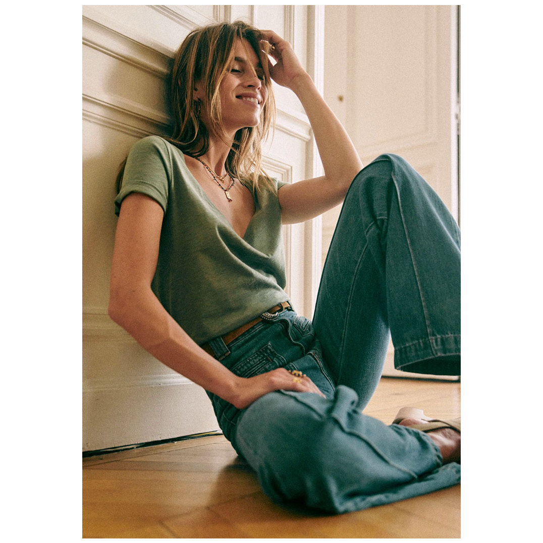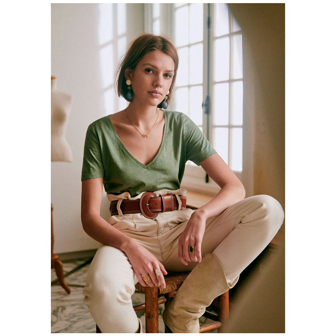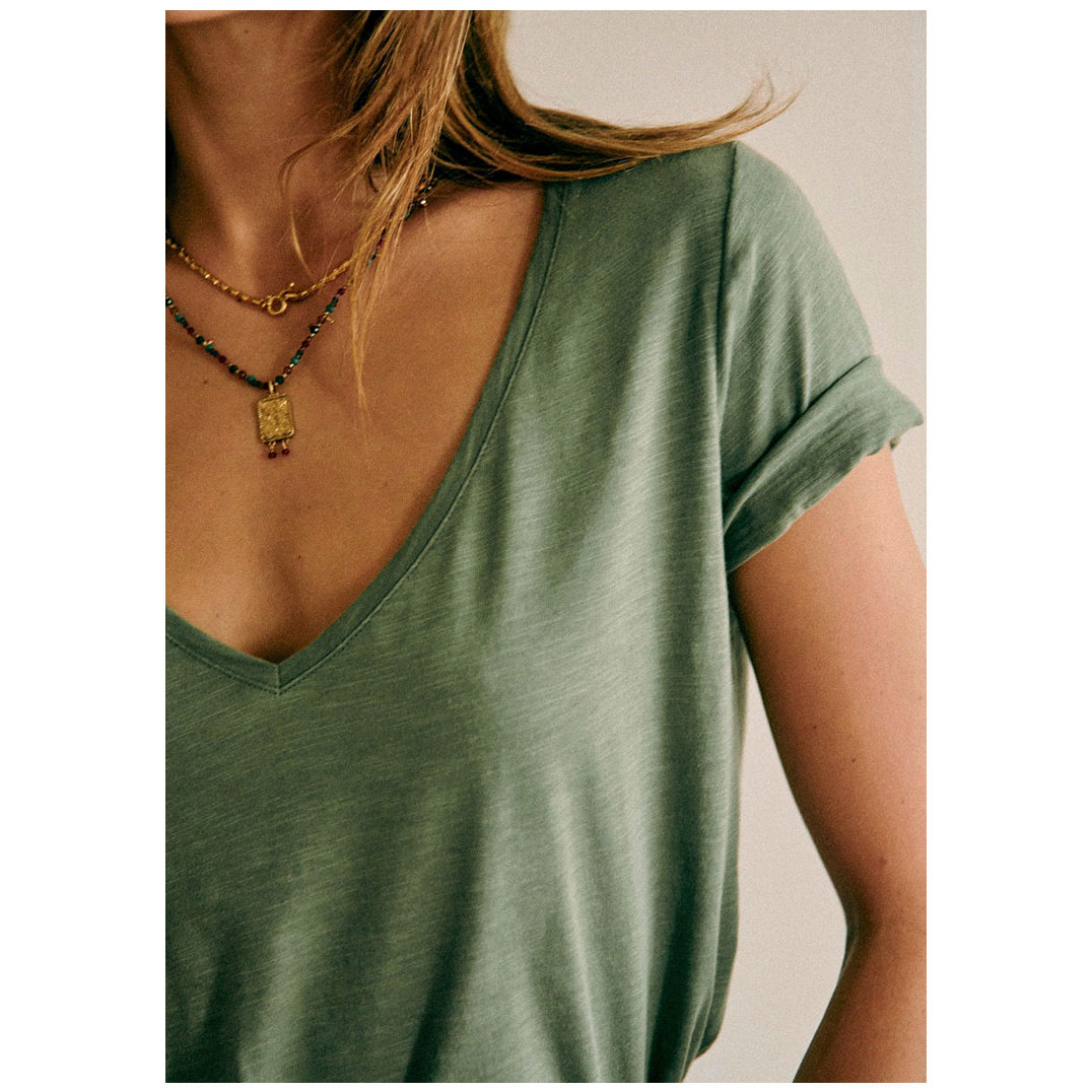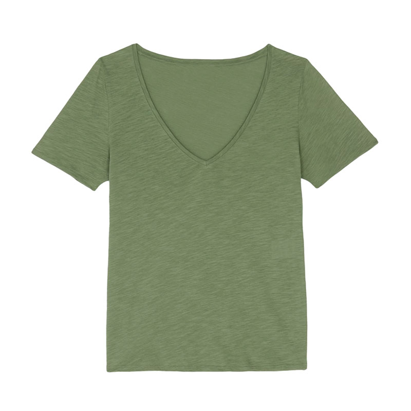 现货法式小众大领口纯棉V领cT恤短袖宽松百搭简约多色绿色上衣女