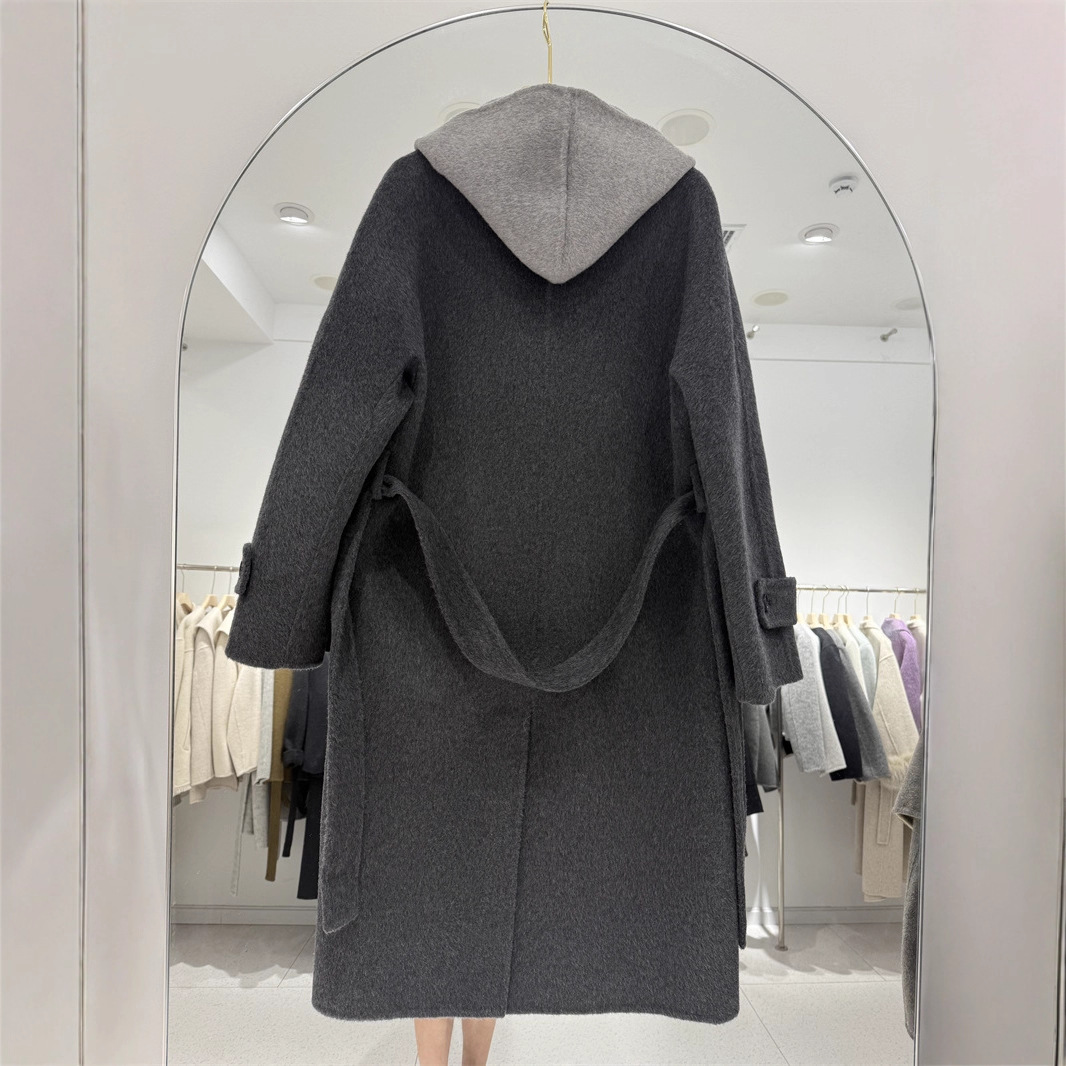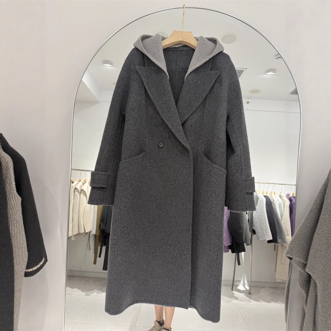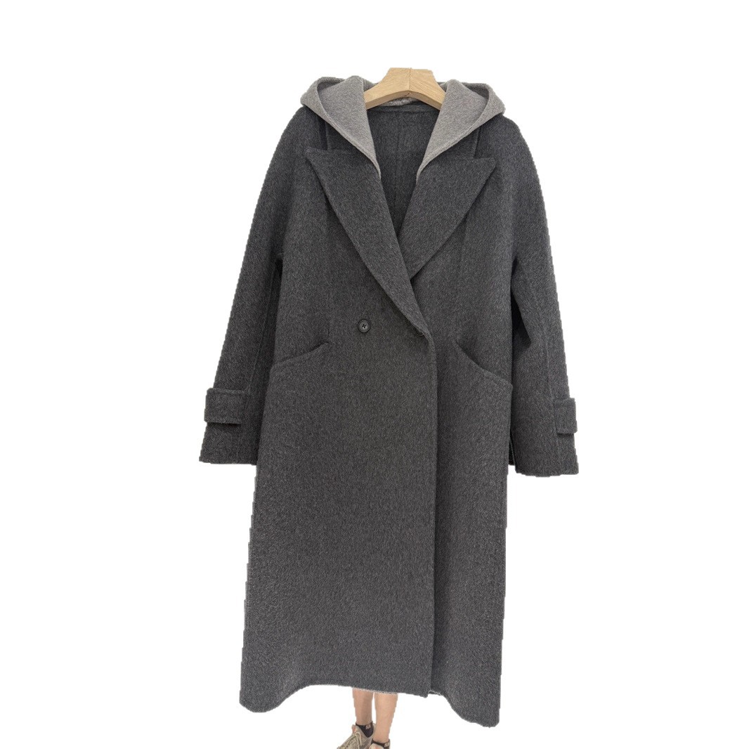 连帽假两件羊毛呢外套女长款2025冬季新款赫本风双面羊毛大衣女