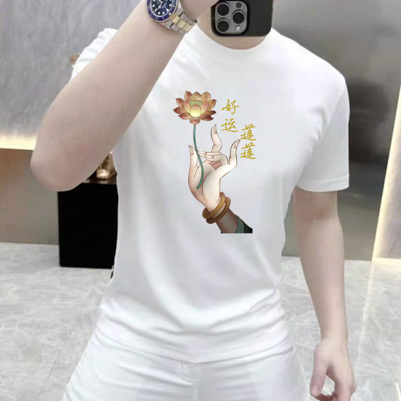 中国风手持莲花t恤好运莲莲纯棉短袖夏季时尚休闲半袖男女同款潮