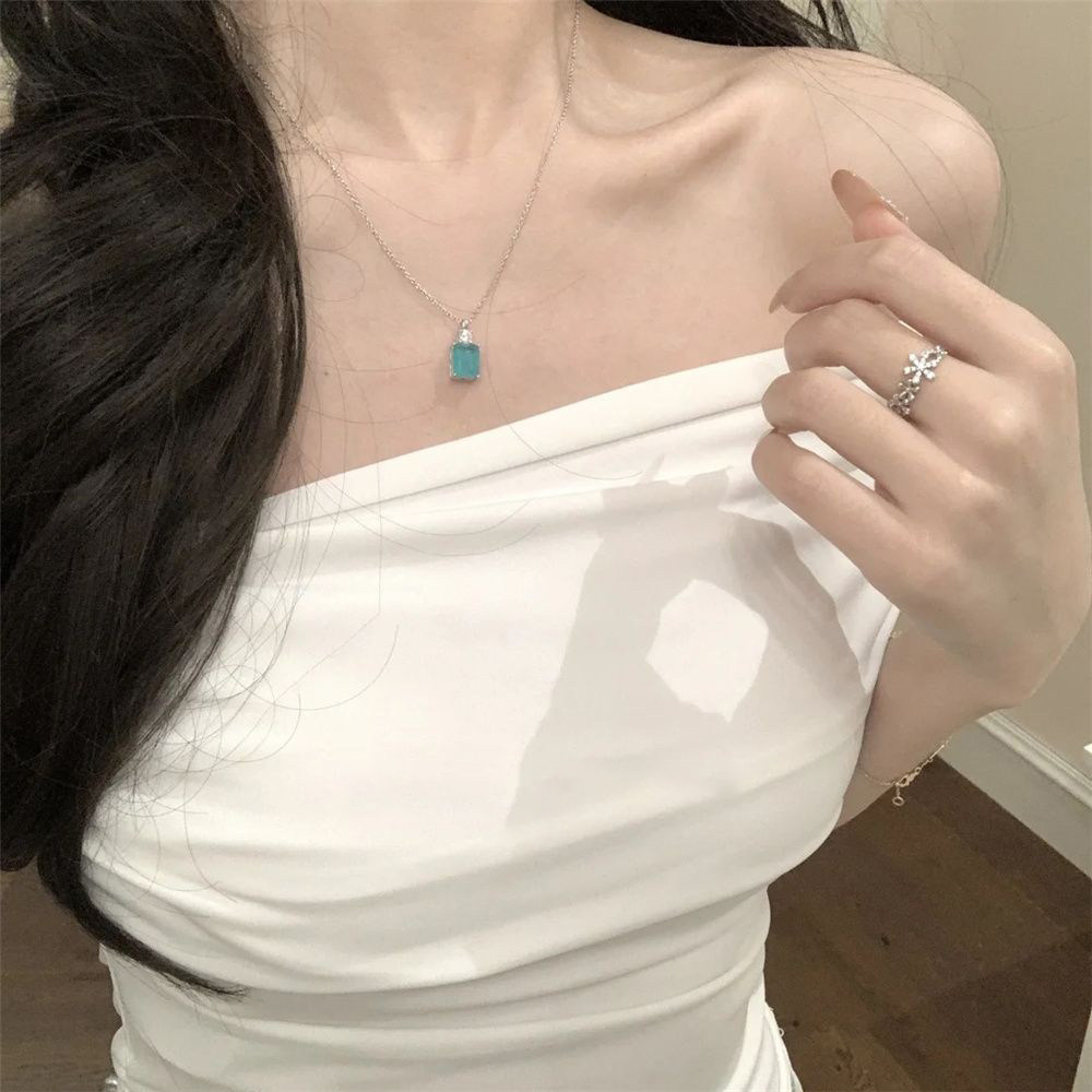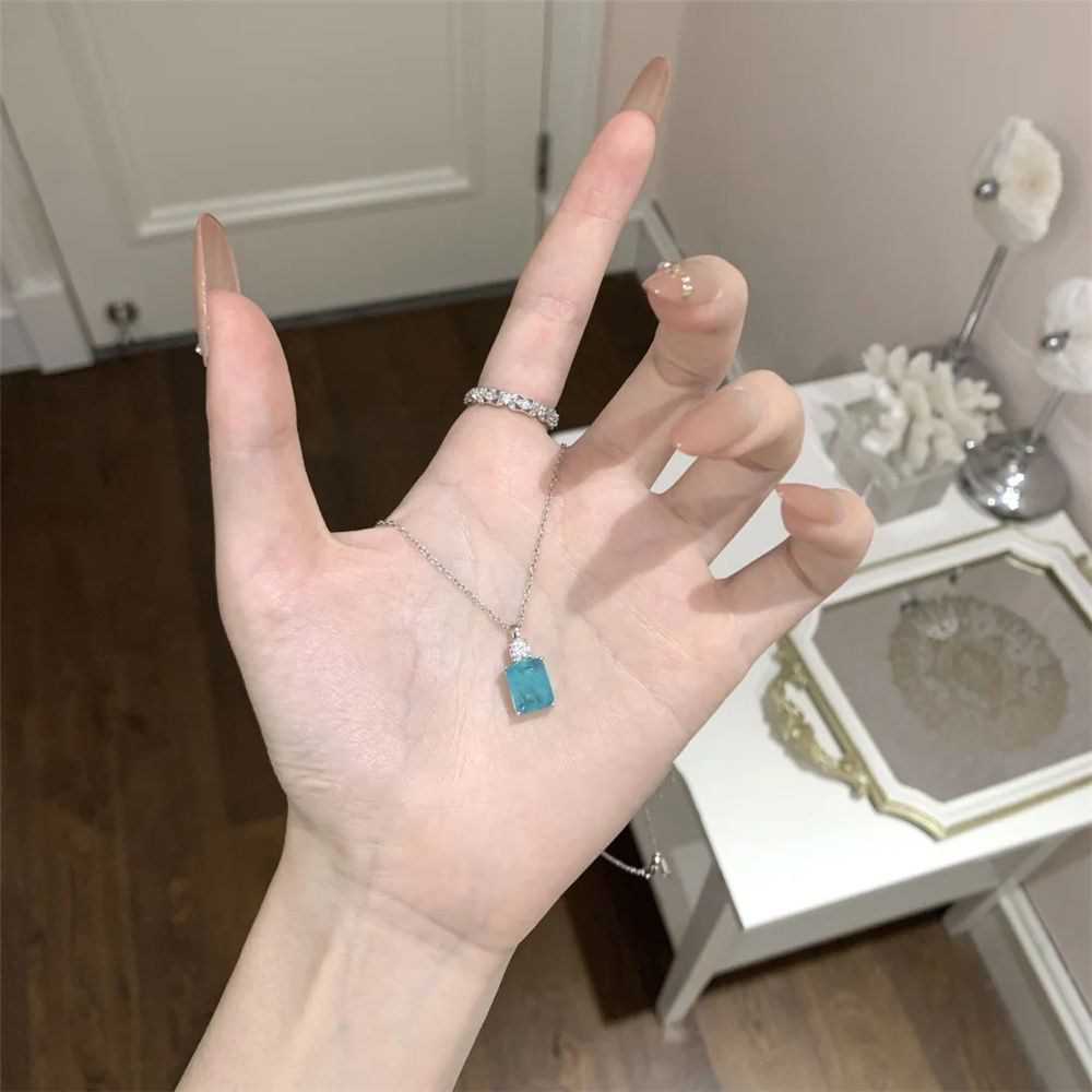S925纯银蓝宝石方块吊坠项链女款高级感轻奢小众清冷感气质锁骨链
