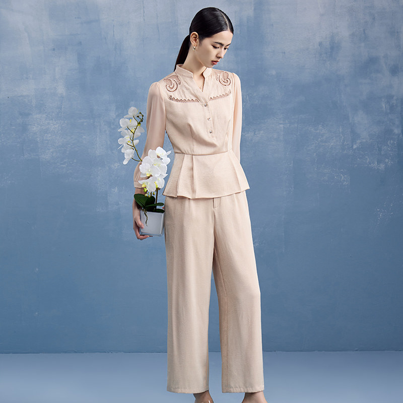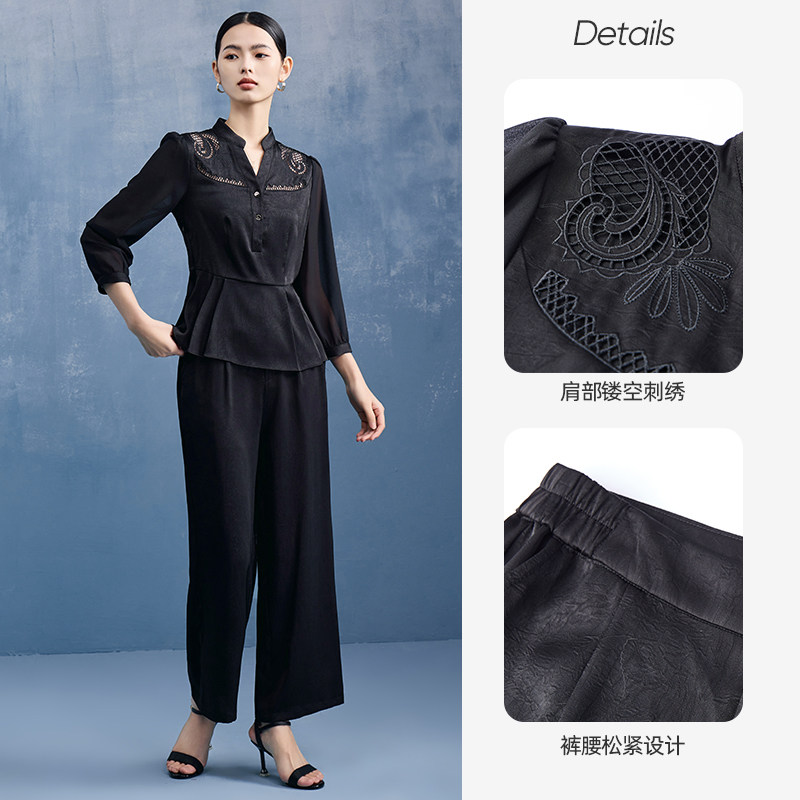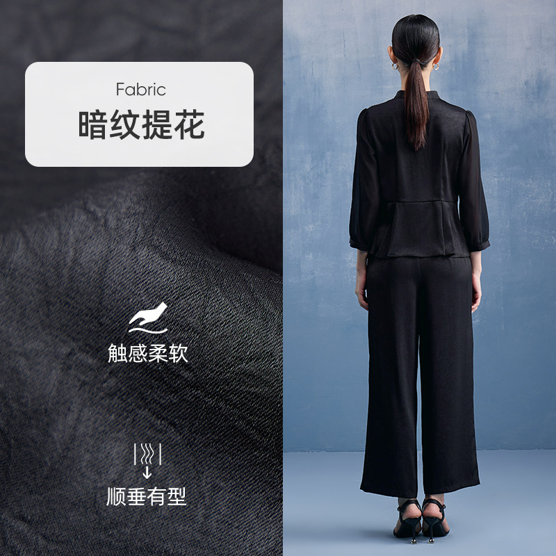 马天奴女装纯色提花七分袖收腰上衣阔腿裤子两件套装早春夏时尚