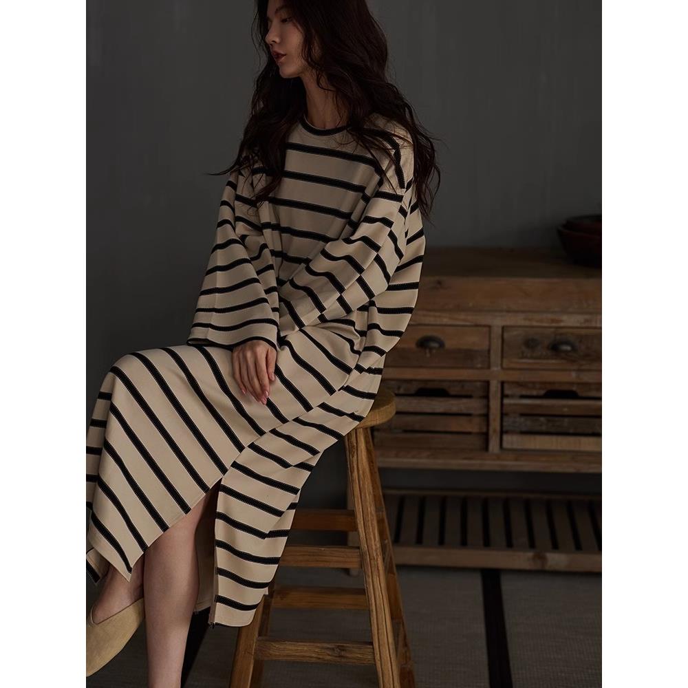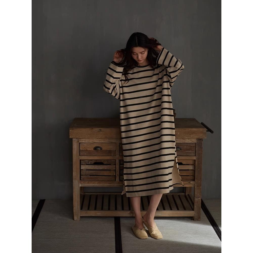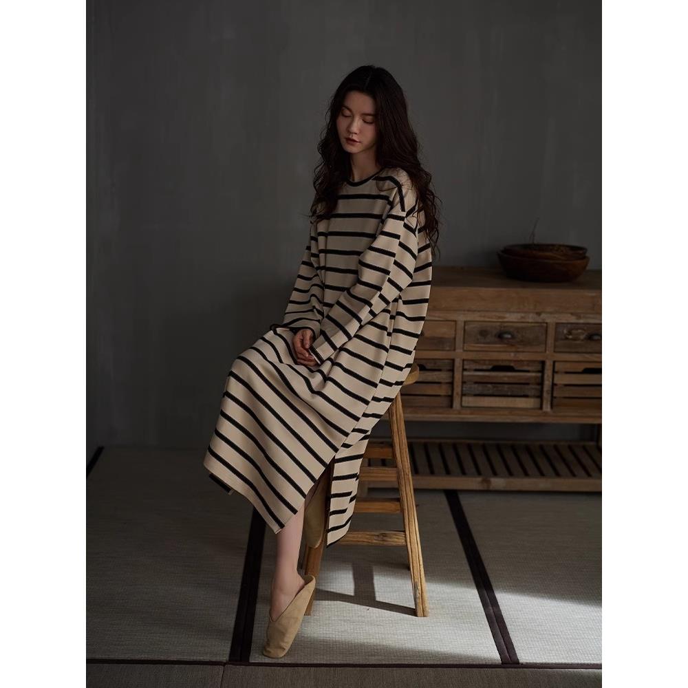 韩国睡衣女士春秋季新款长袖莫代尔棉中长款睡裙条纹家居服可外穿
