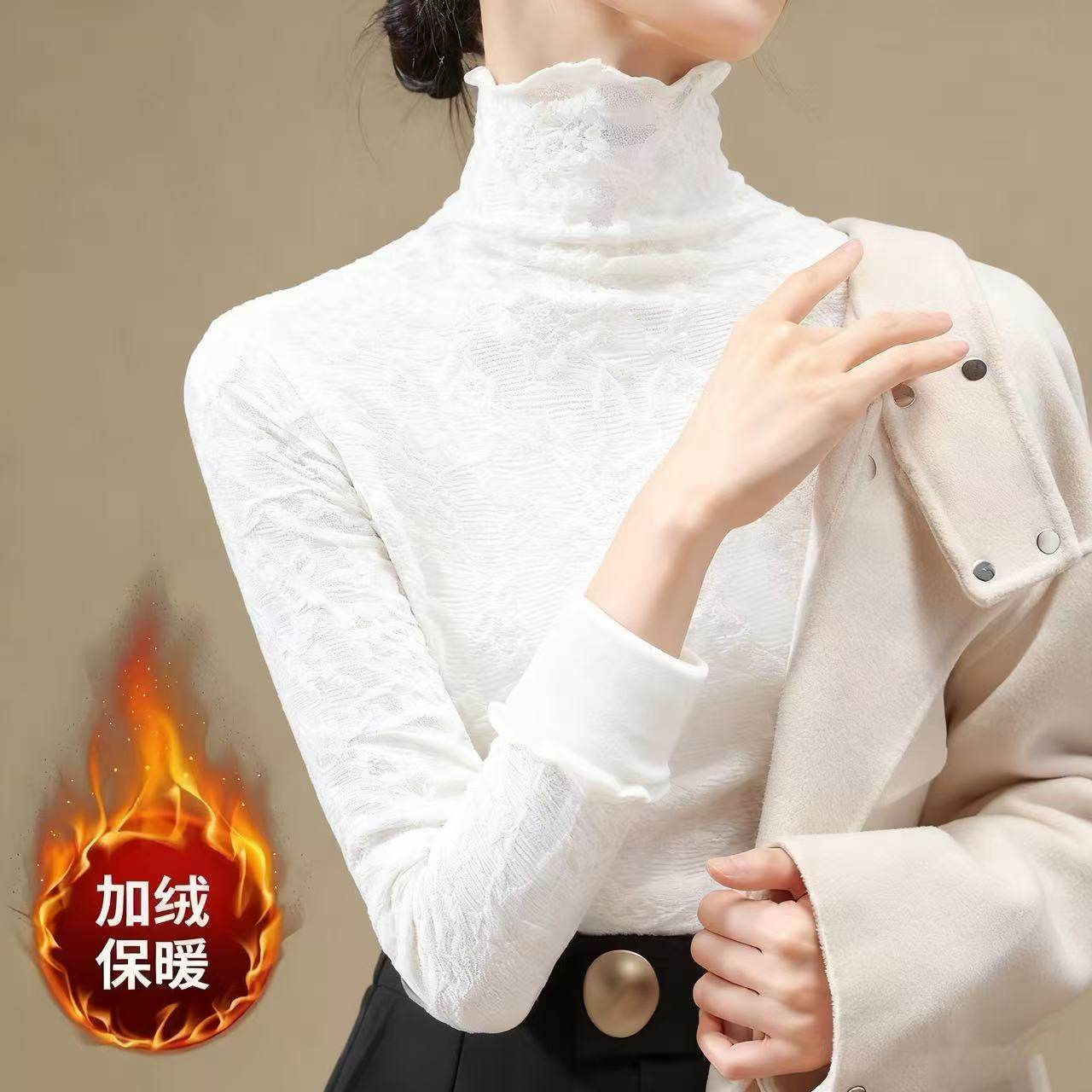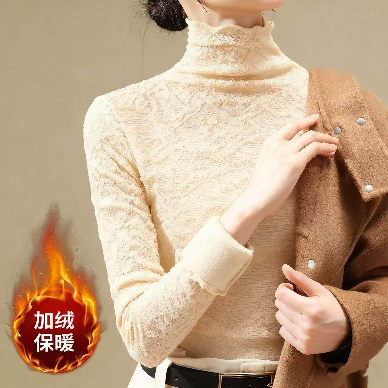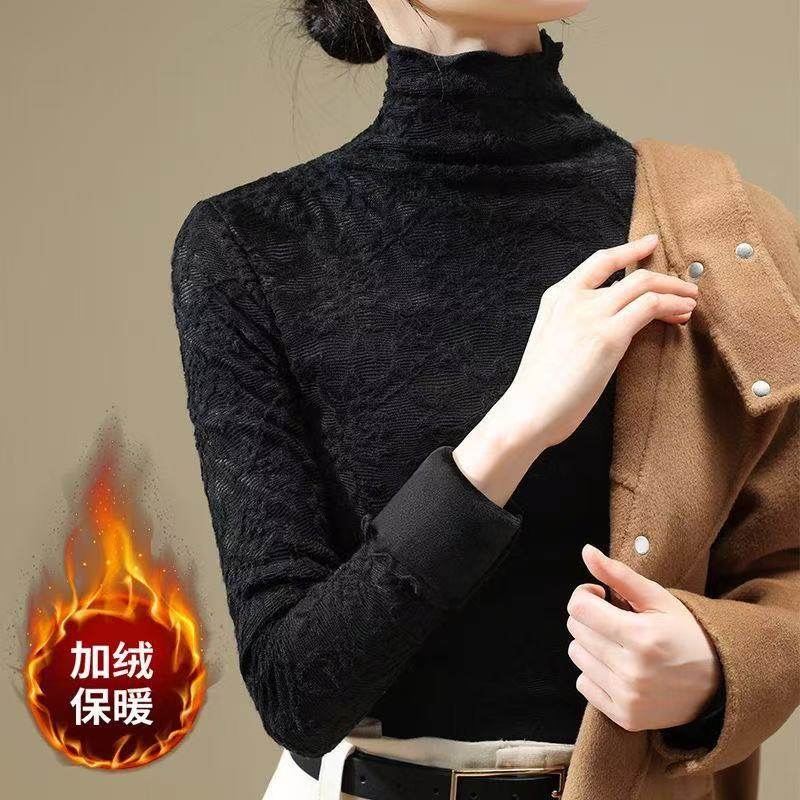 2025新款高端黑色蕾丝上衣女秋冬内搭时尚洋气加绒加厚高领打底衫