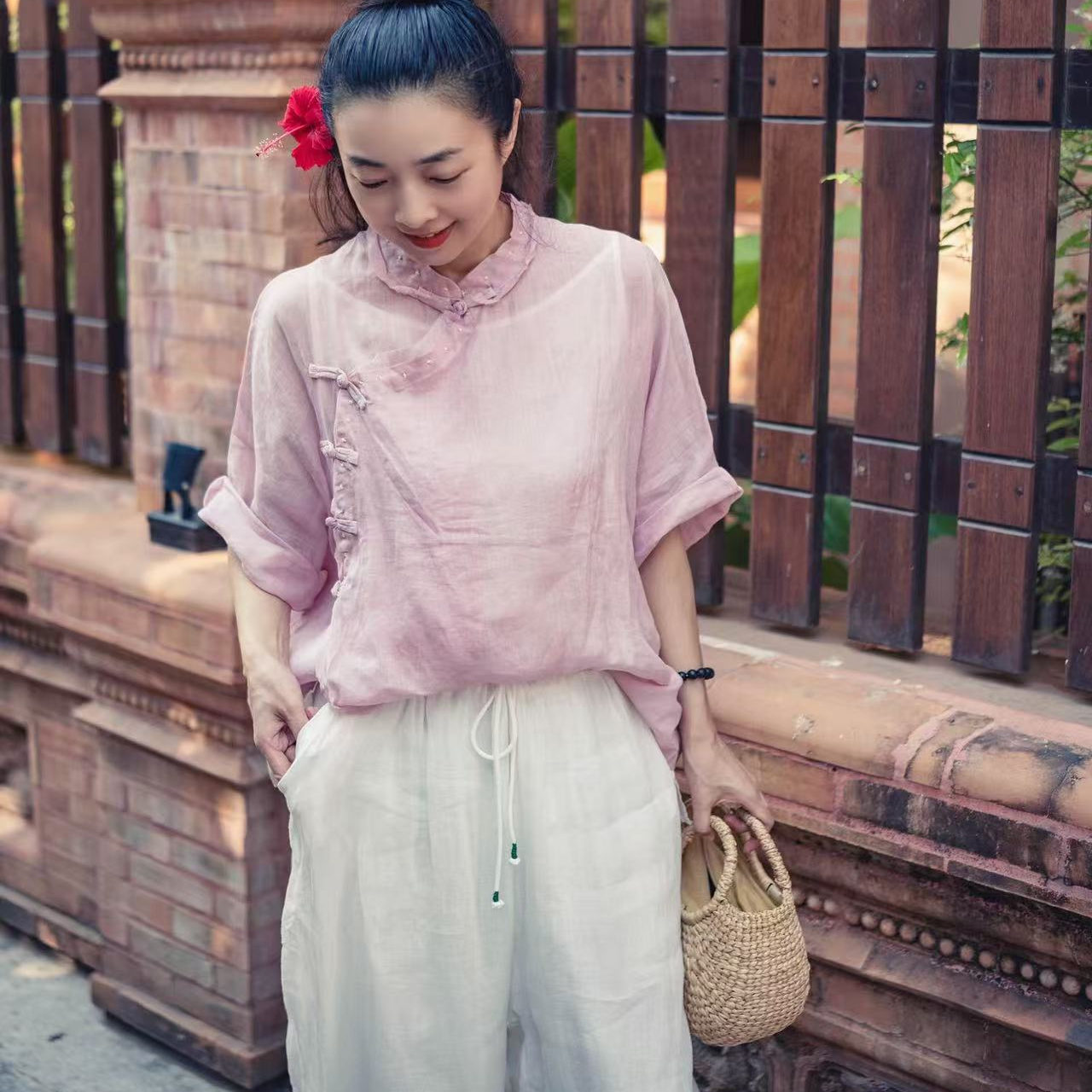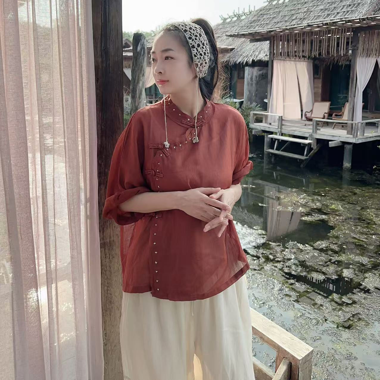 特价清仓换季清仓苎麻绣线中式国风衬衫复古禅意茶服上衣女