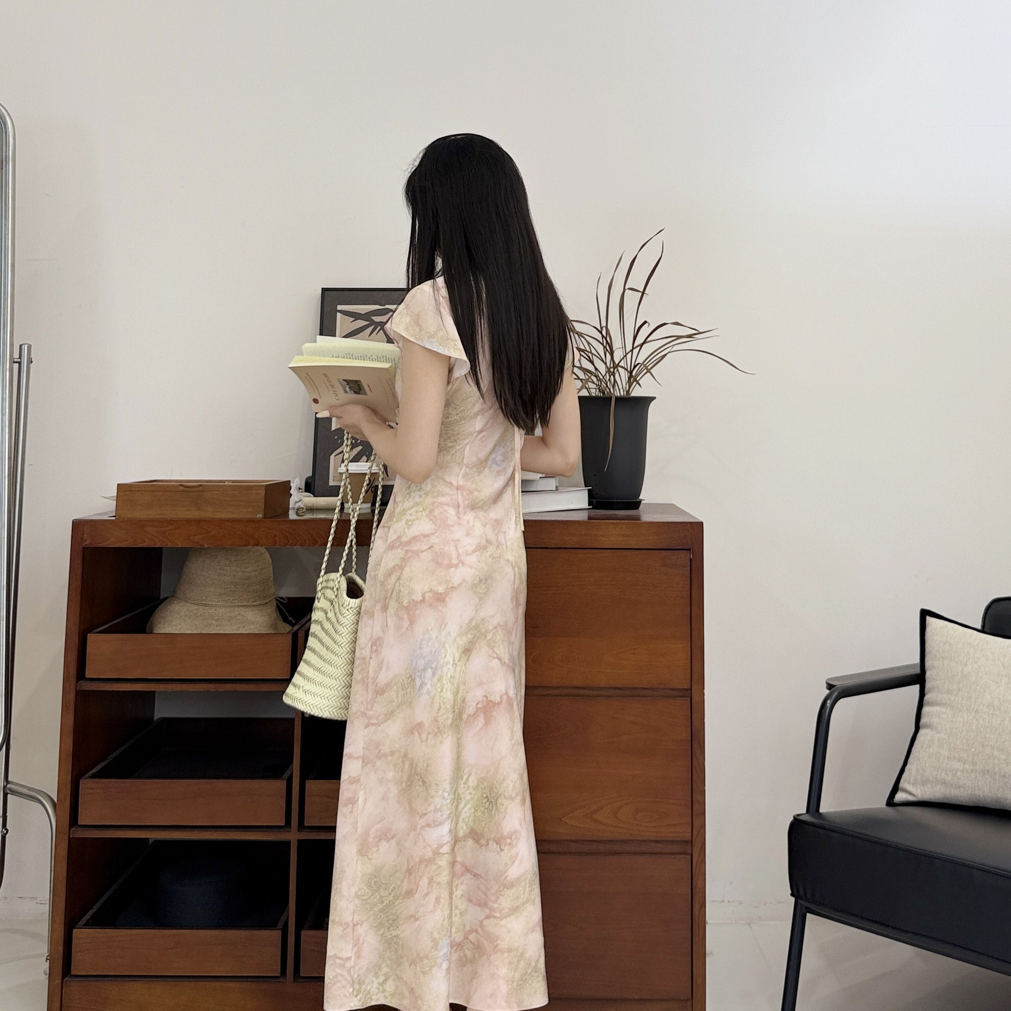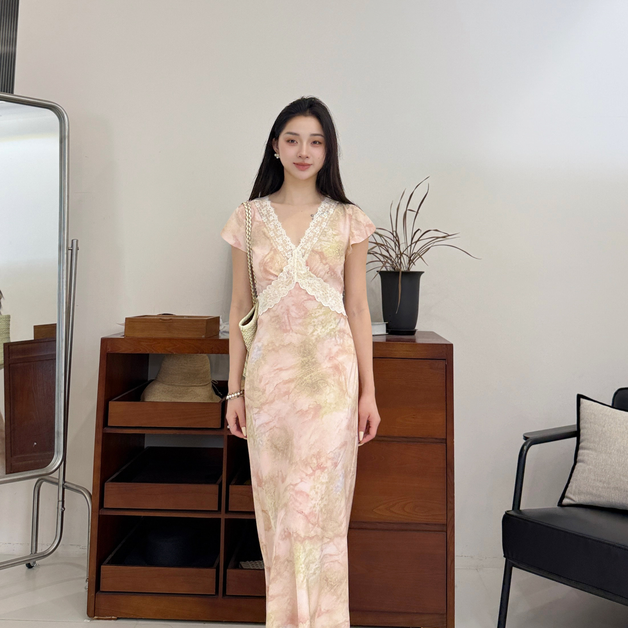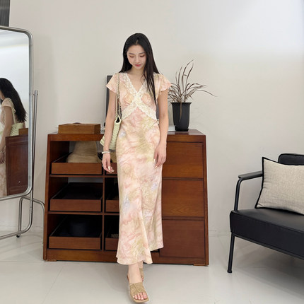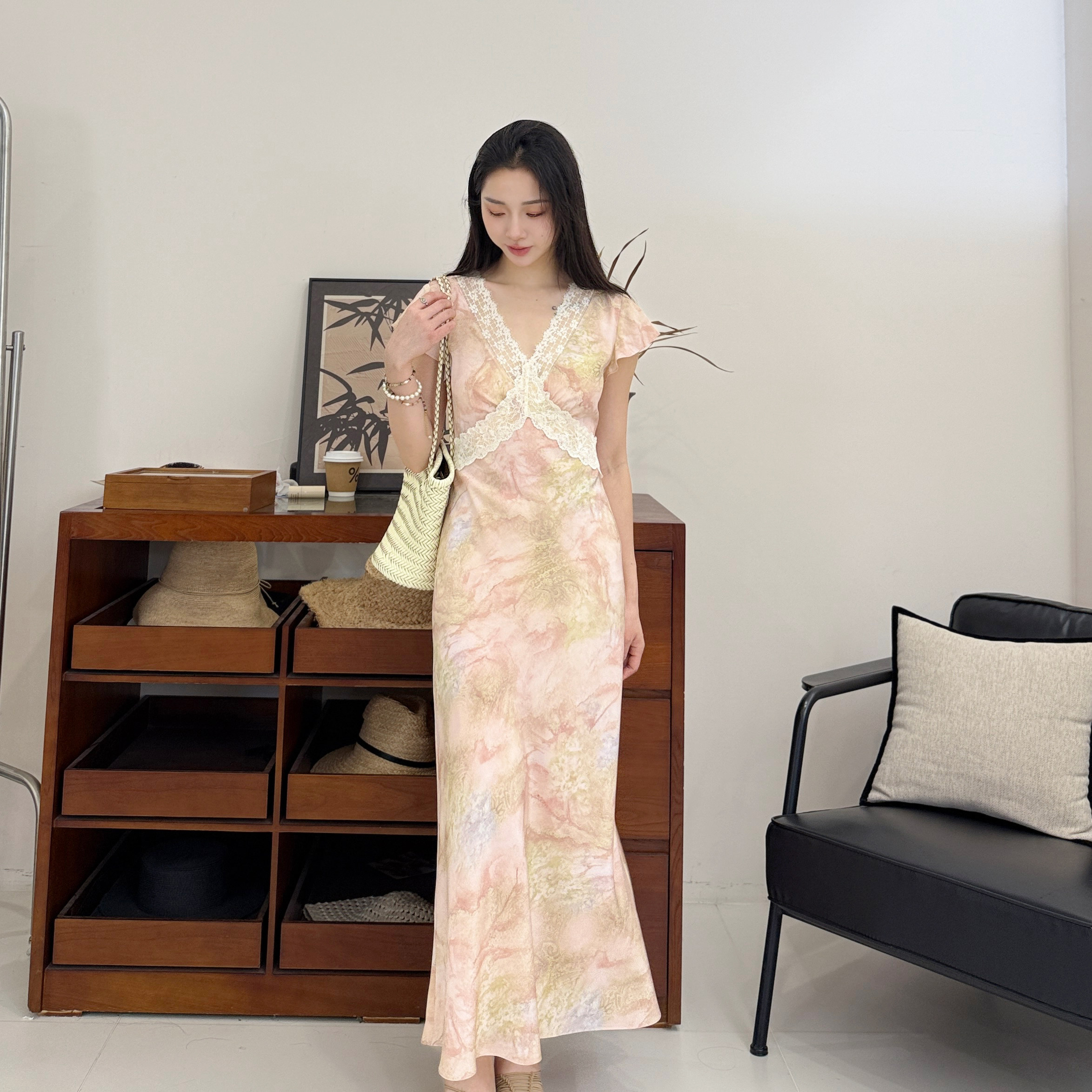 粉雾嫣然丨100桑蚕丝丨45°斜裁丨23姆米真丝重绉V领连衣裙MY6129