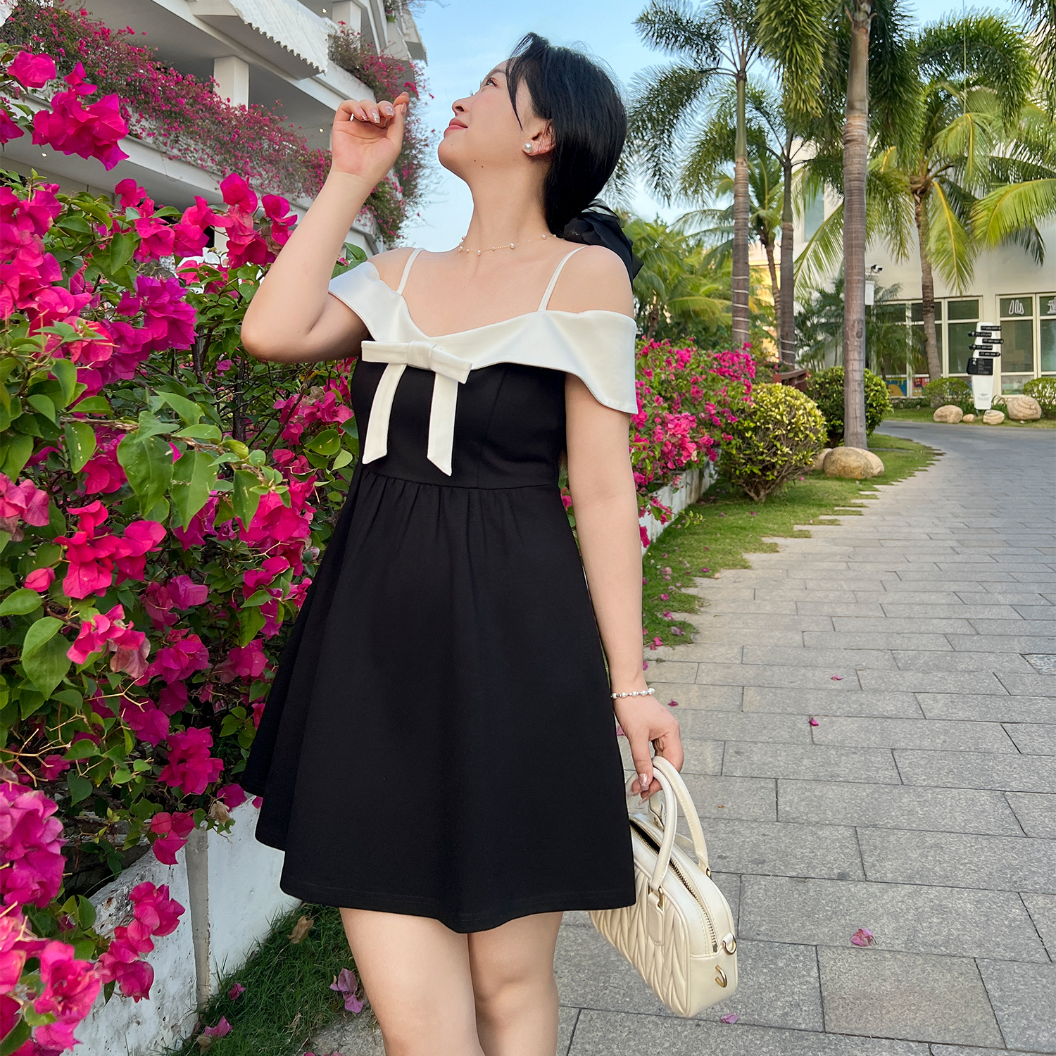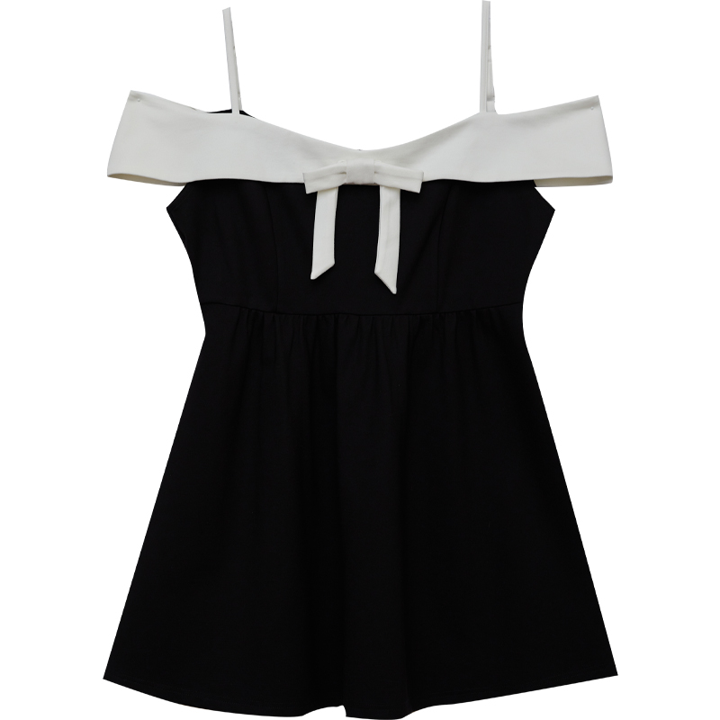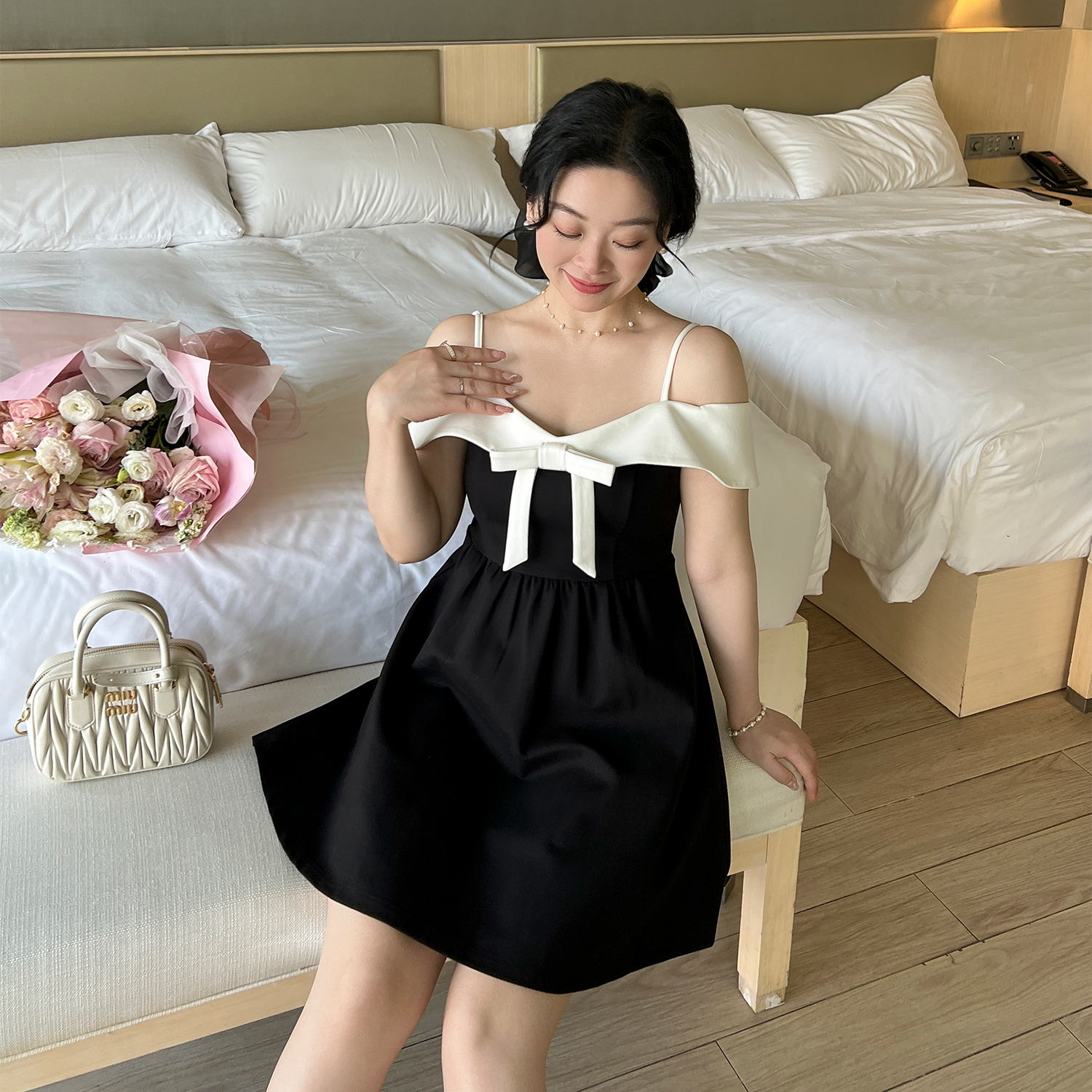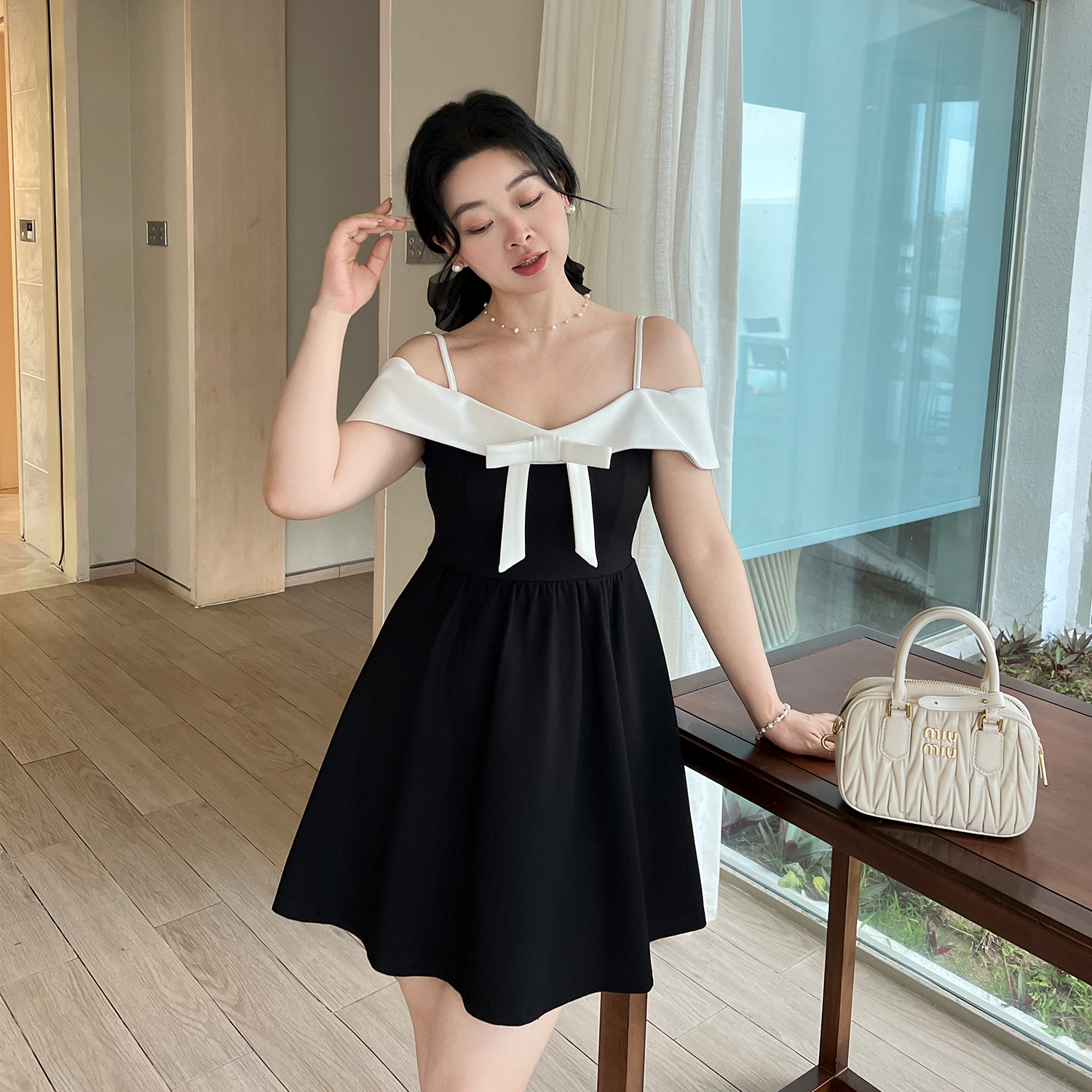 DM100大码百分百2025夏季新款女装一字肩小黑裙性感撞色A字连衣裙
