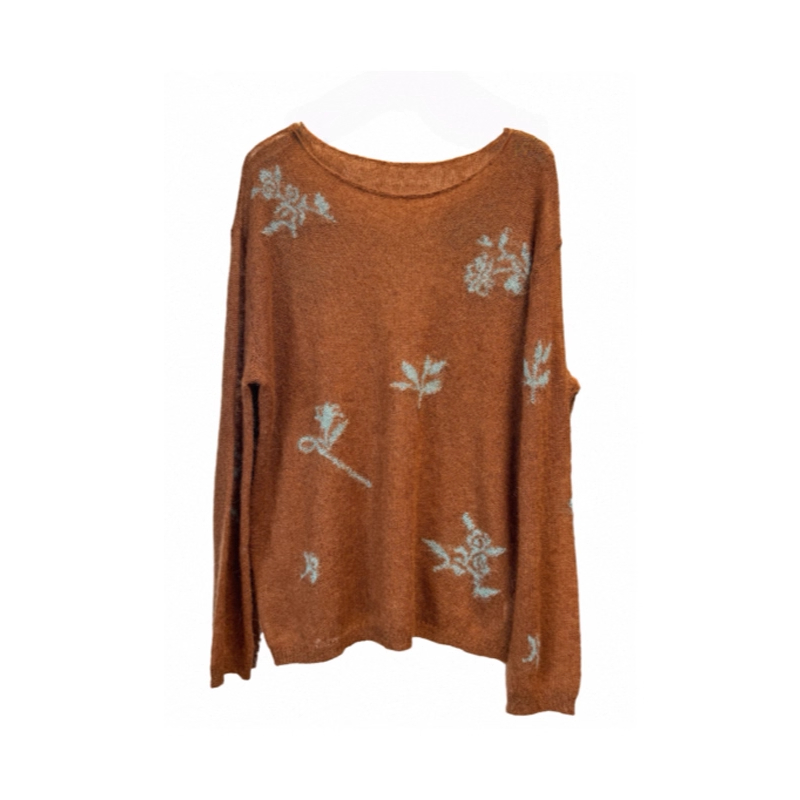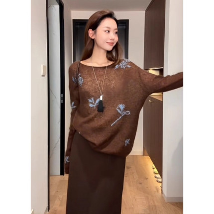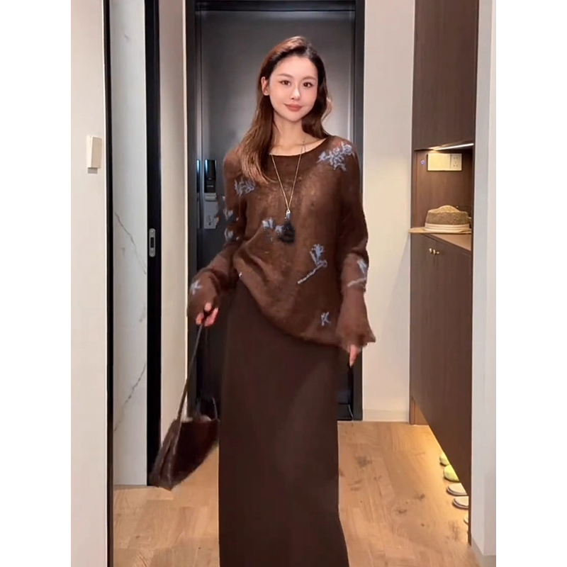 韩系早秋氛围感穿搭咖色圆领套头毛衣女秋冬宽松慵懒风针织衫上衣