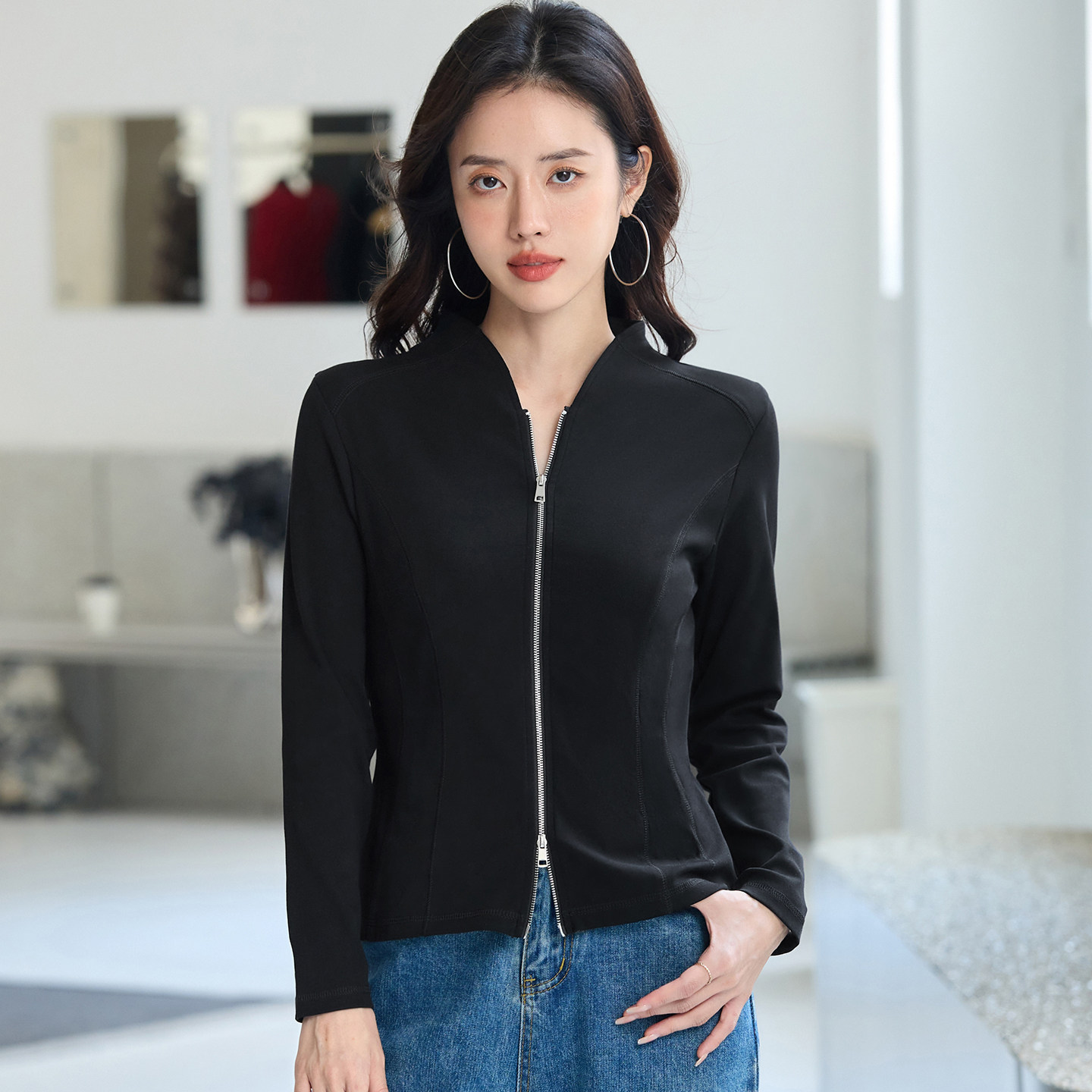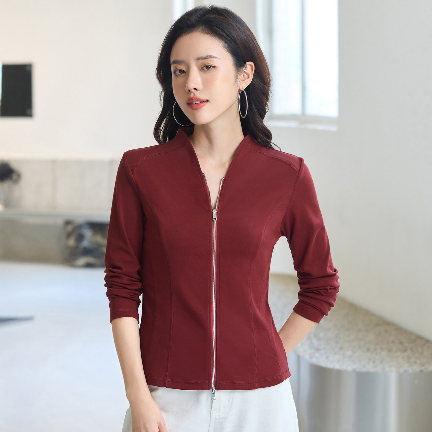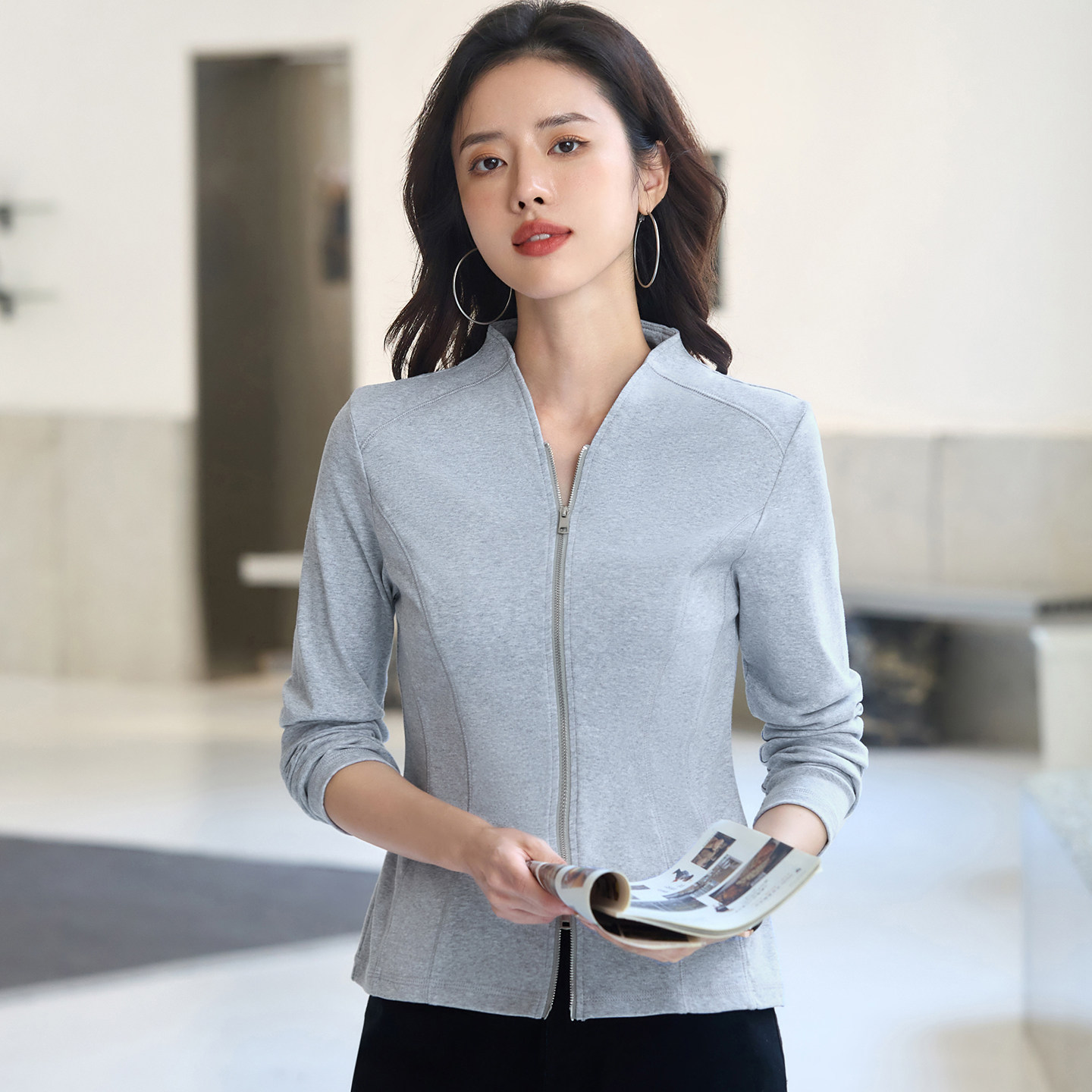 v领开衫拉链纯棉长袖t恤女打底衫