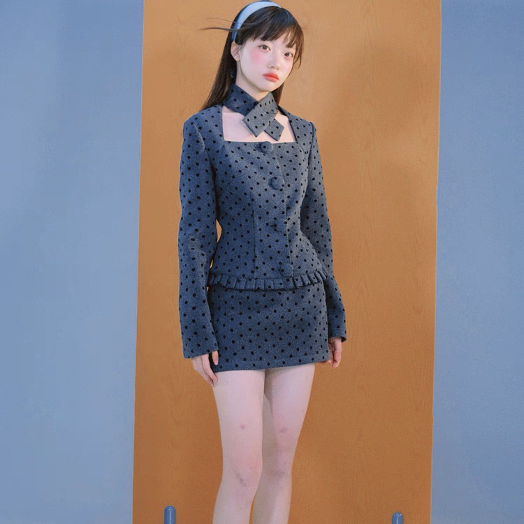 里织兀LZW |复古波点文艺显瘦设计感秋冬灰色修身西装两件套女装