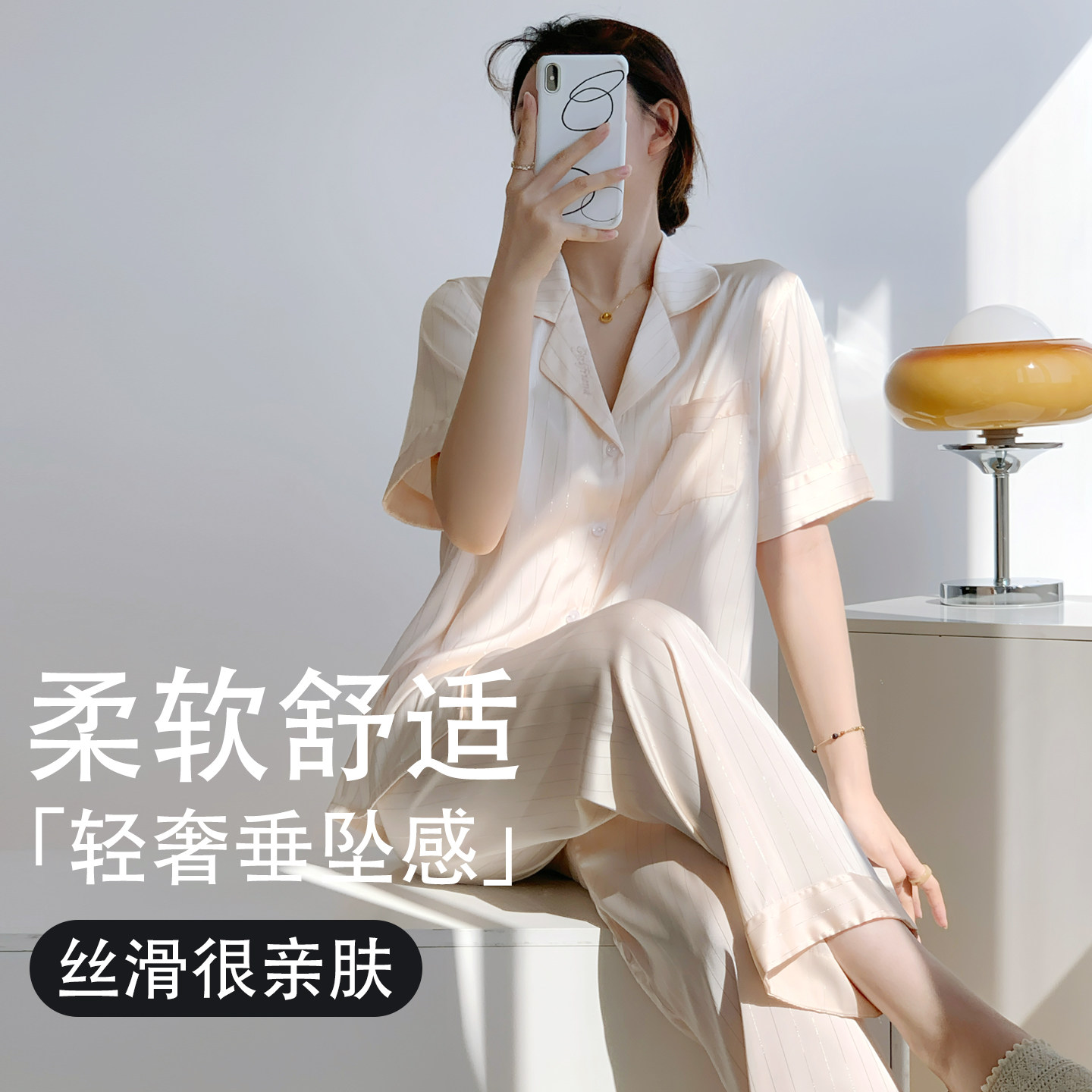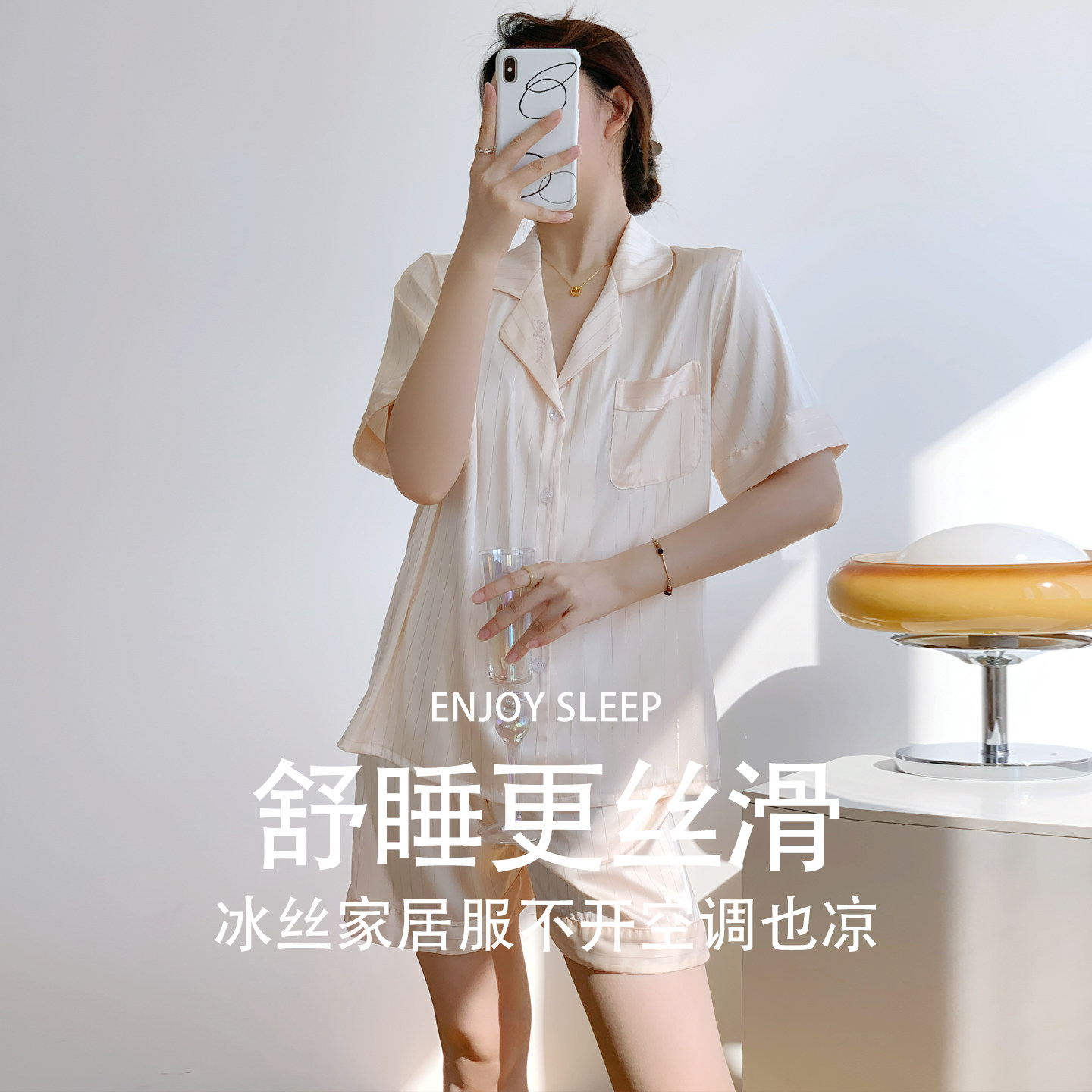 乐姿梦条纹冰丝凉感睡衣情侣款春夏季短袖高级感家居服男女三件套
