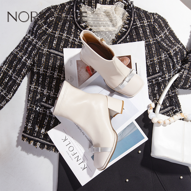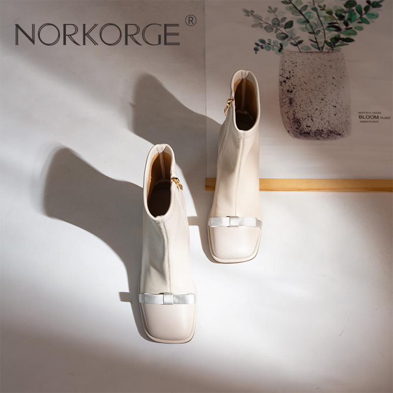 2025新款冬英伦风白色蝴蝶结方头粗跟气质瘦瘦靴弹力短靴高跟女靴