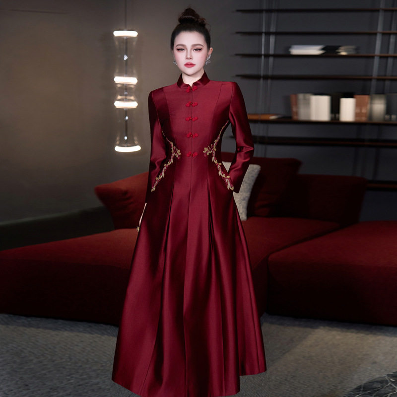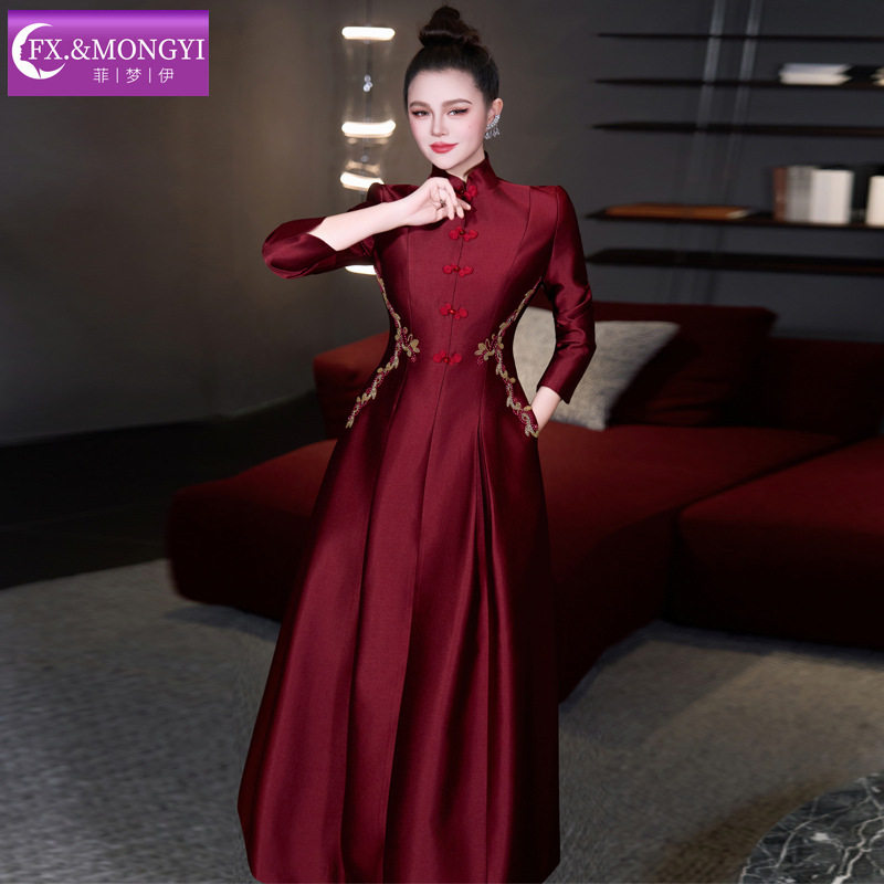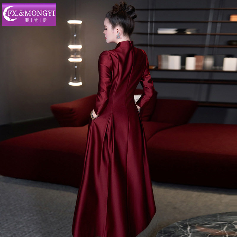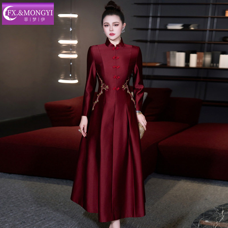 菲梦伊红色连衣裙女冬季新款轻奢收腰中长款大摆裙宴会结婚敬酒服
