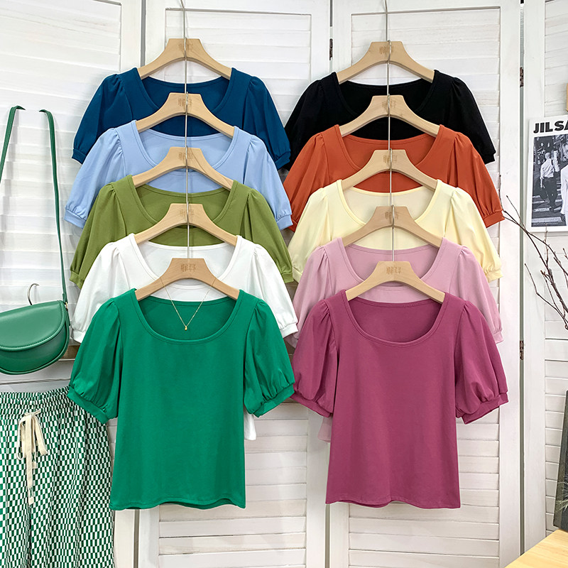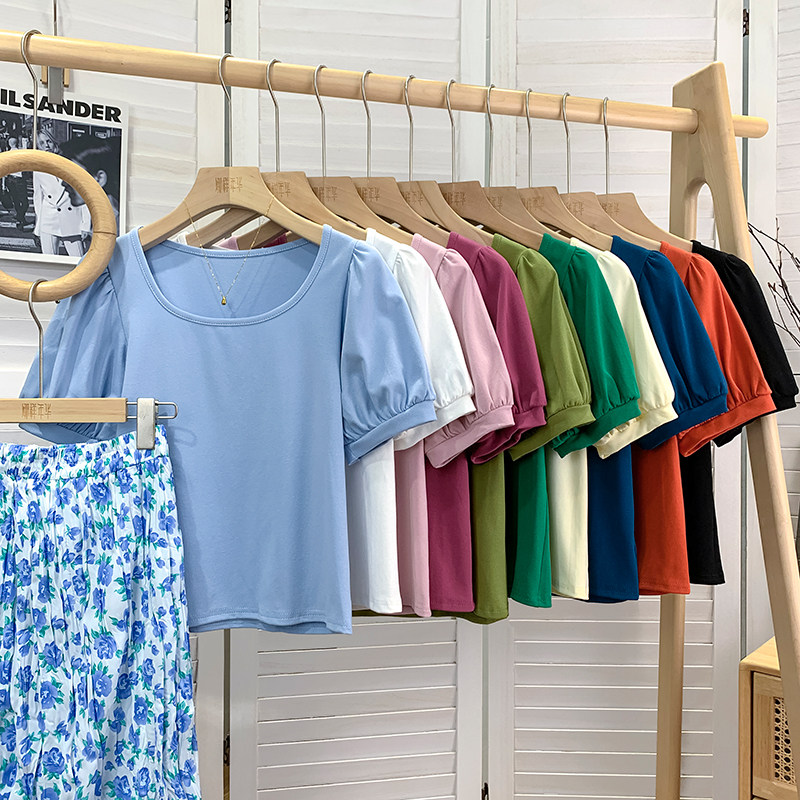 法式方领树莓粉色泡泡短袖T恤女夏宽松显瘦百搭洋气复古打底上衣