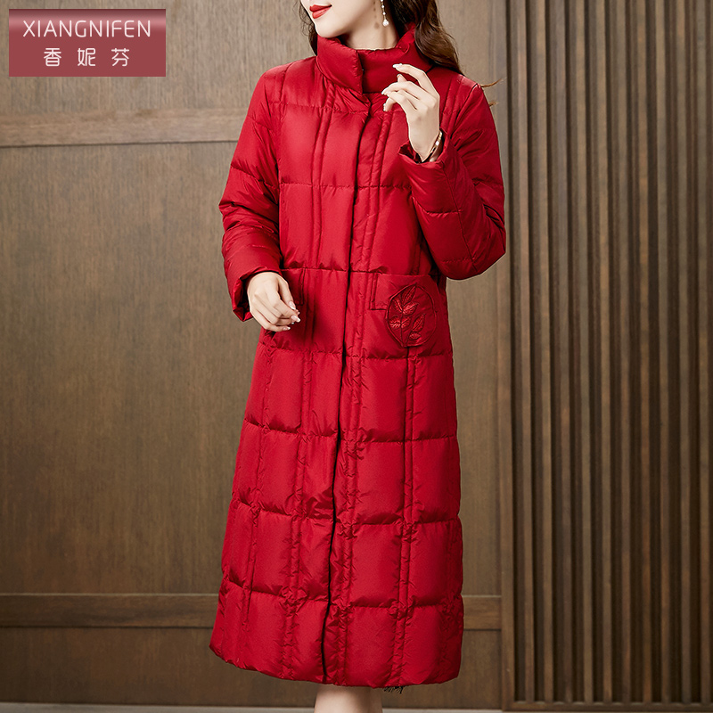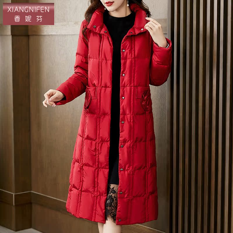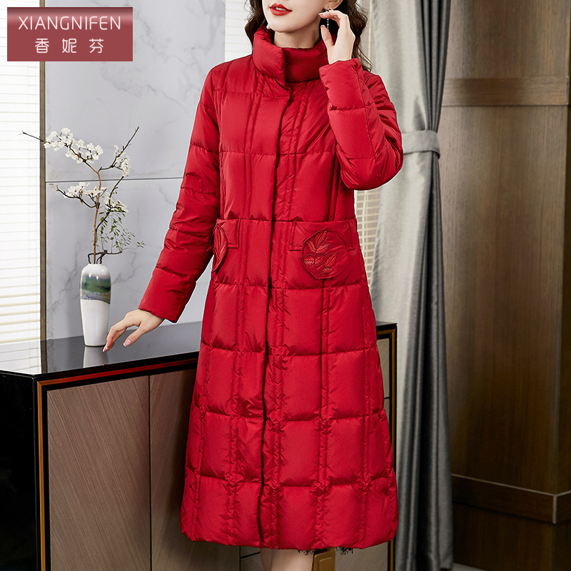 过膝中长款白鹅绒羽绒服女2025新款冬季高端奢华修身中老年外套