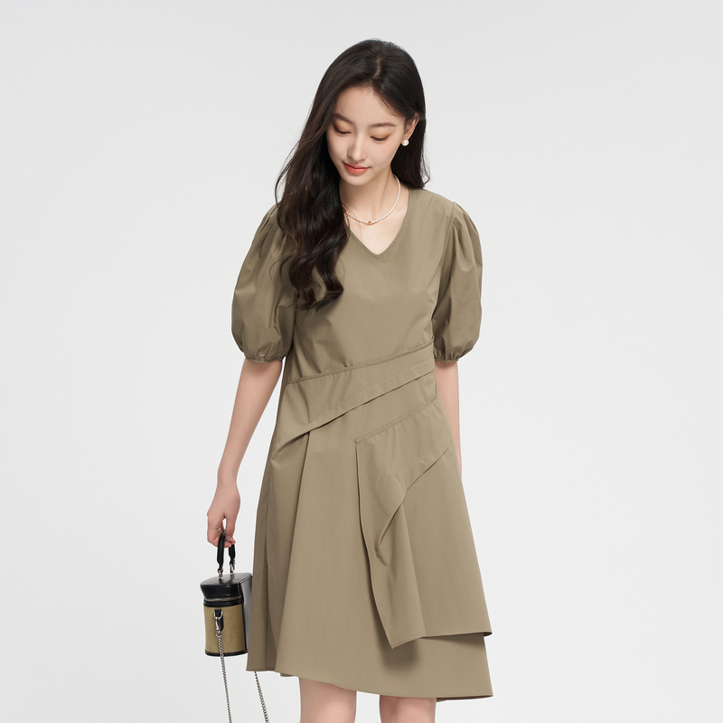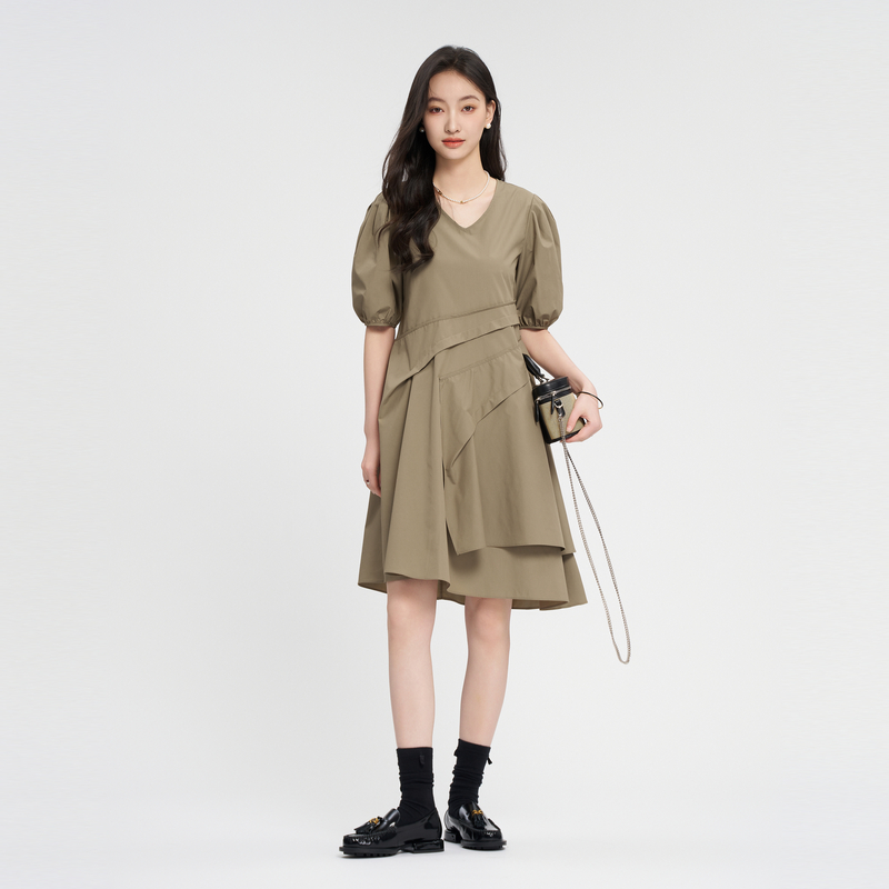 XG/雪歌XK204588A807驼色拼接连衣裙时尚夏季新款V领收腰A字裙女