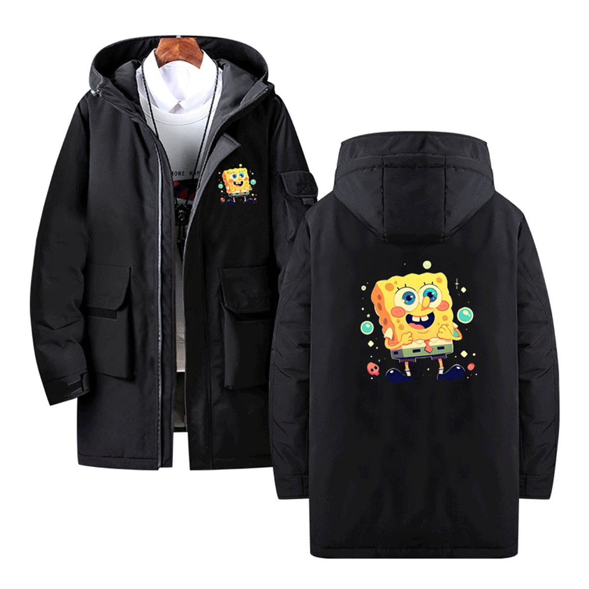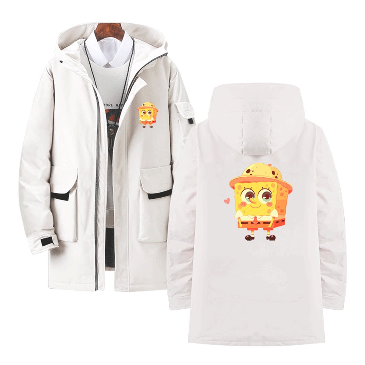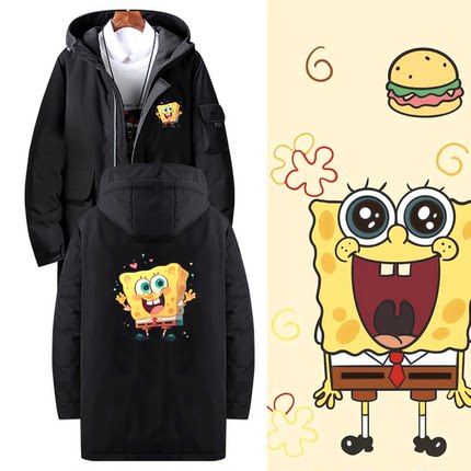 海绵宝宝二次元卡通印花秋冬新款男女情侣冬季定制外套带帽羽绒服