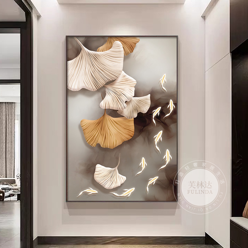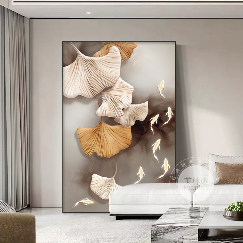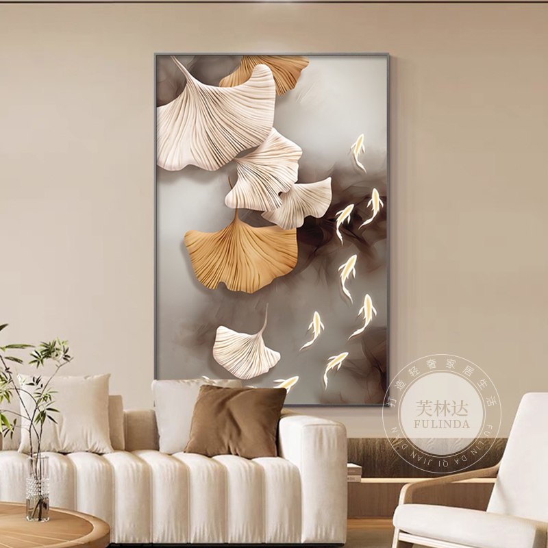客厅装饰画新款高级感银杏叶大气九鱼图挂画现代简约走廊过道壁画