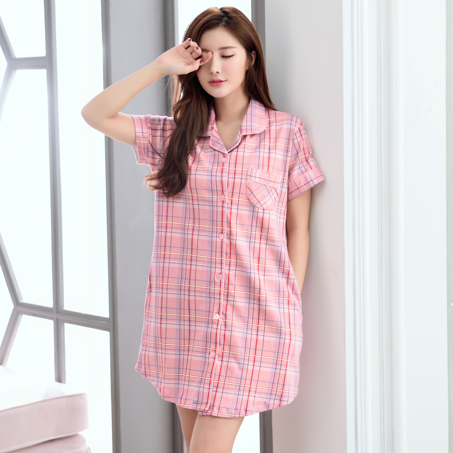 睡裙女夏季纯棉短袖格子可外穿大码薄款高级感开衫性感连衣裙睡衣