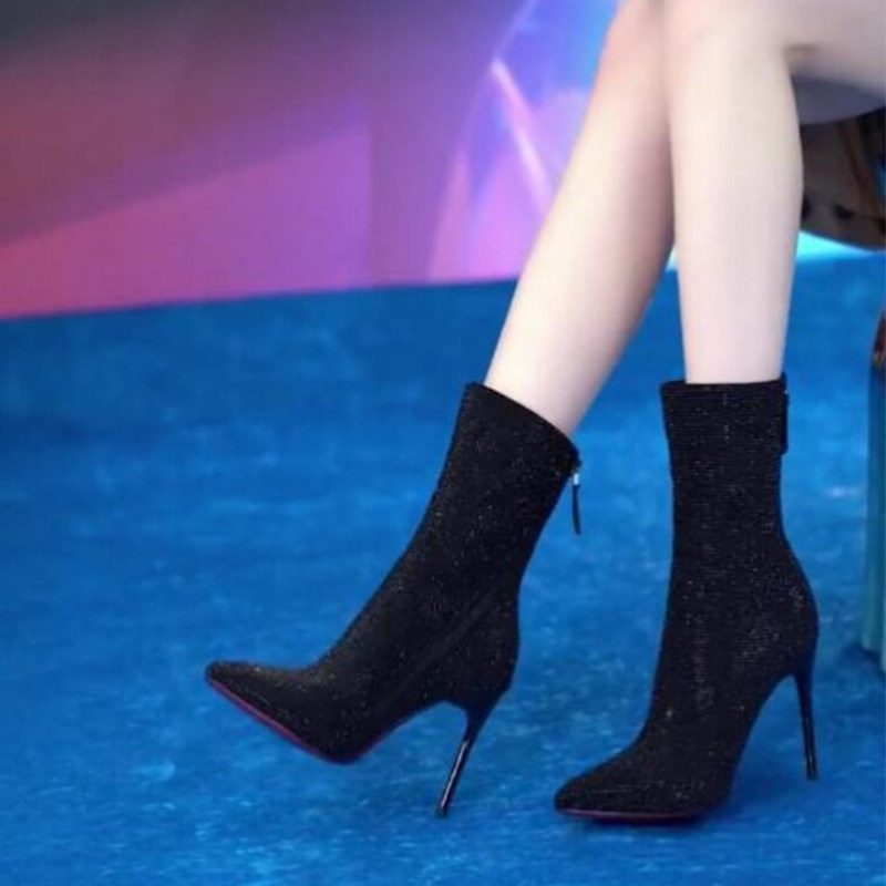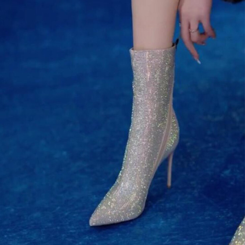 欧美水钻高跟时装靴女2025年春季新款弹力瘦瘦靴侧拉链尖头马丁靴