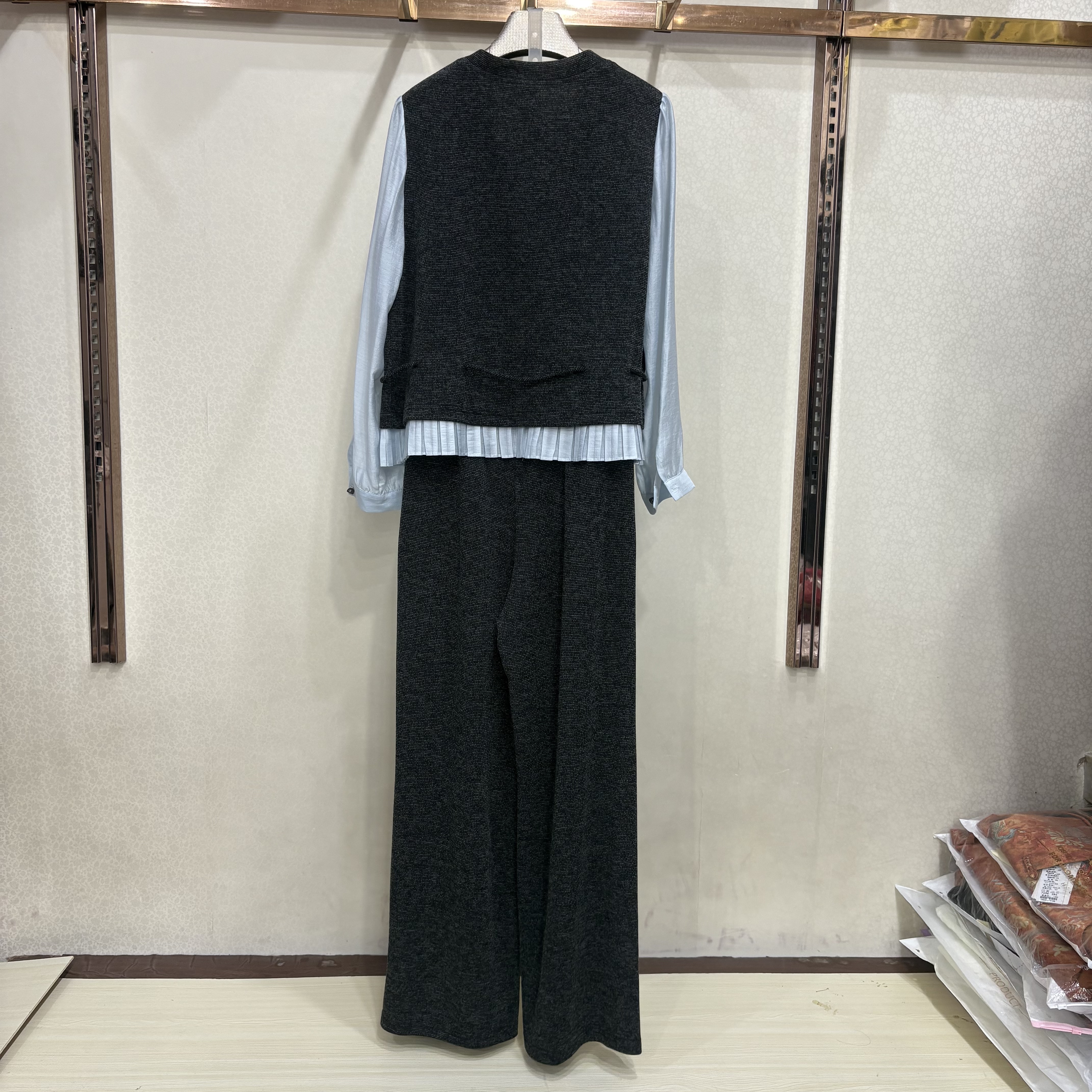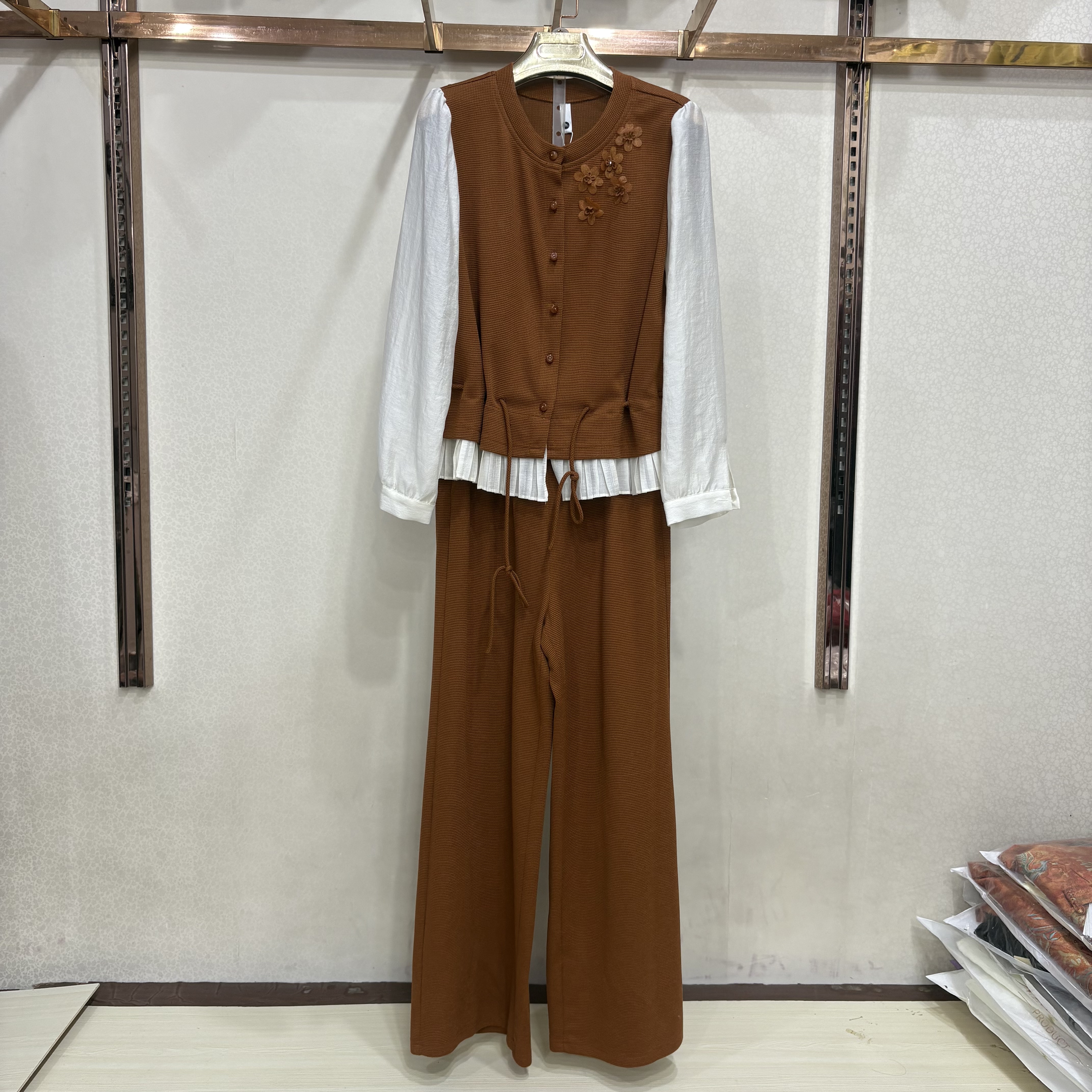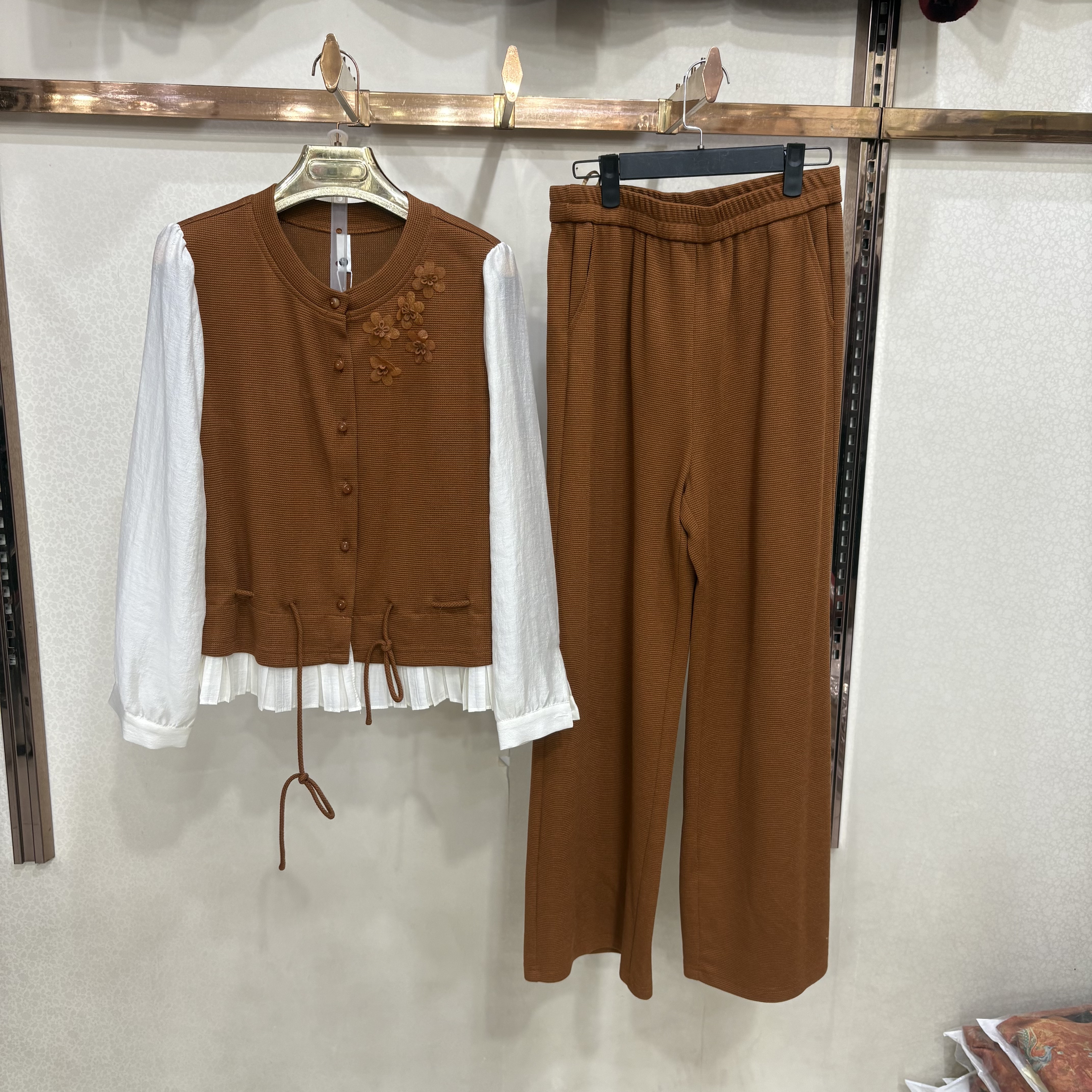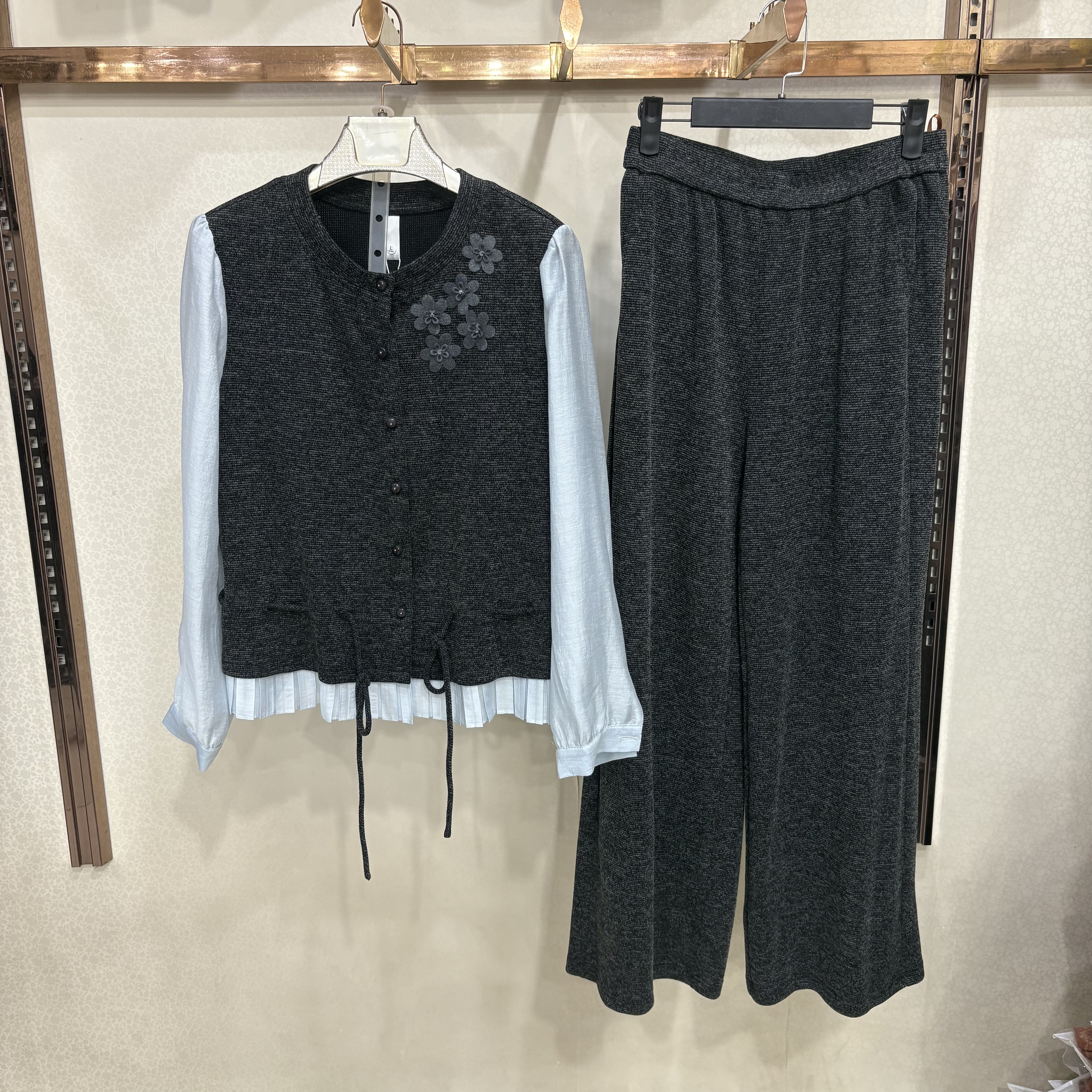 商场同款86006春季新款假两件拼接上衣+阔腿裤两件套抽绳收腰套装