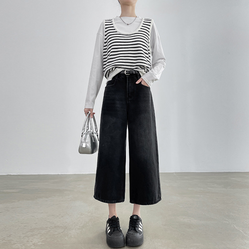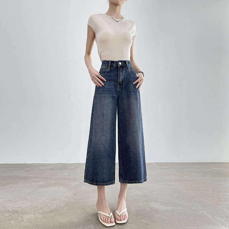蓝色八分直筒牛仔裤女春夏2025年新款高腰宽松显垂感七分阔腿裤子