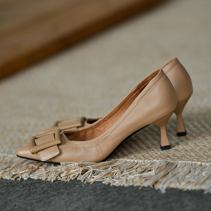 皮厚先生 杏色高跟鞋真皮2024春季新款女鞋 尖头鞋细跟浅口单鞋女