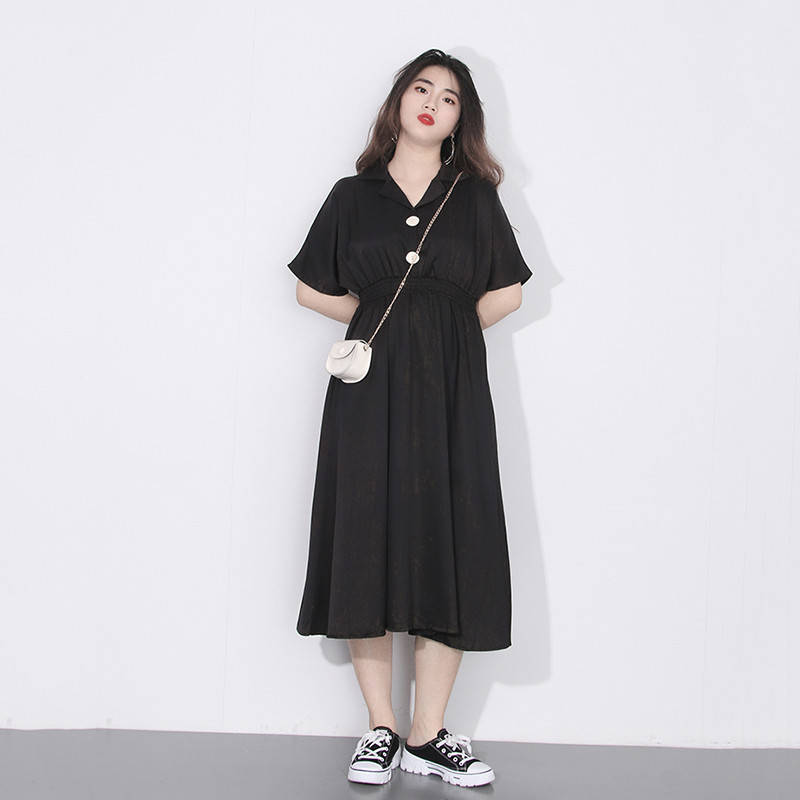 大码胖mm宽松显瘦松紧腰收腰雪纺连衣裙女中长款遮肚遮胯裙子夏季