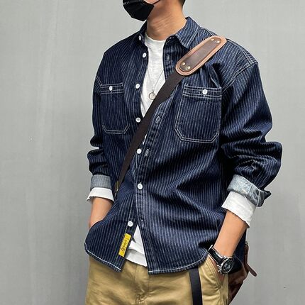 休闲宽松条纹牛仔长袖衬衫男春秋