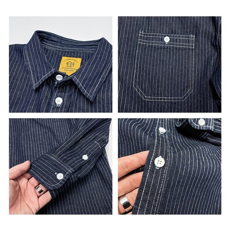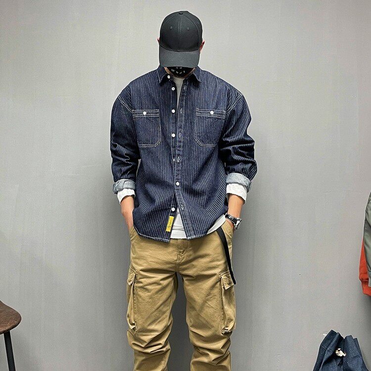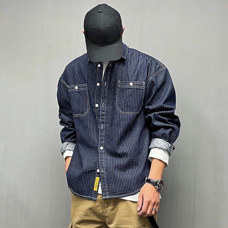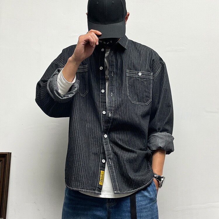 美式复古休闲宽松条纹牛仔长袖衬衫男春秋季潮牌男装百搭衬衣外套