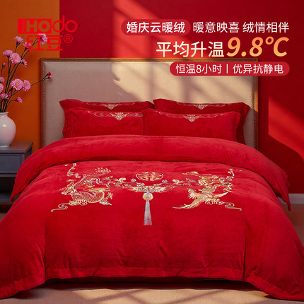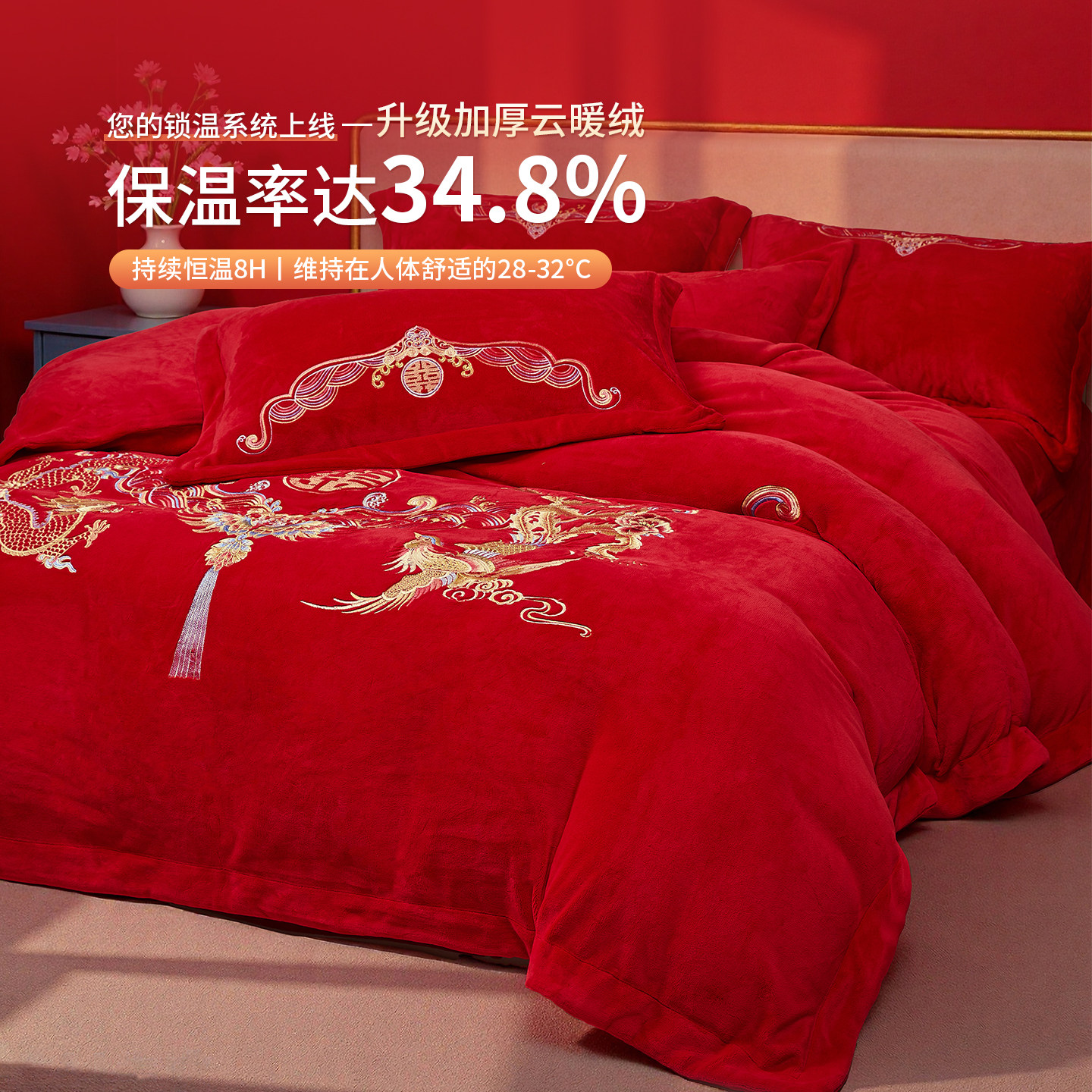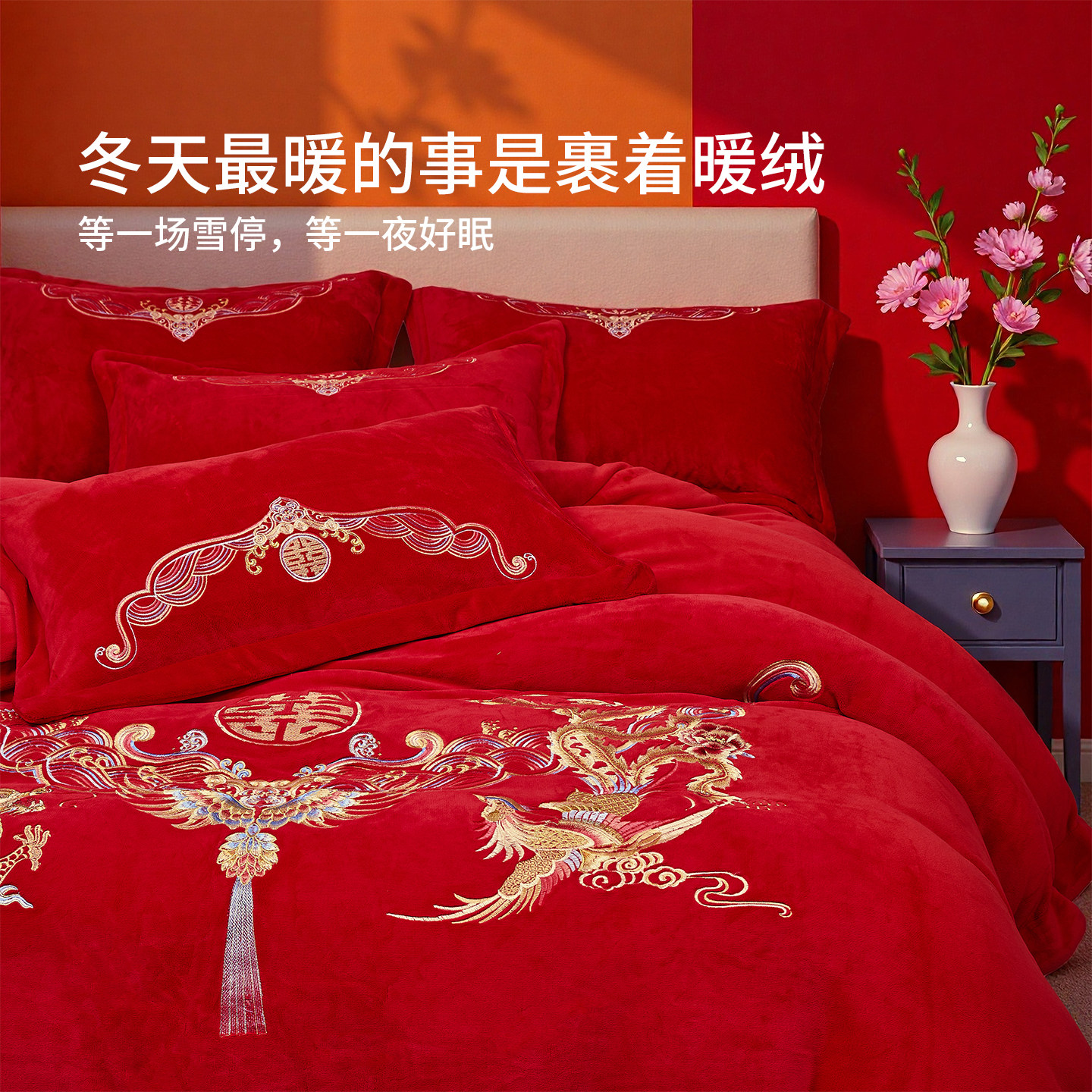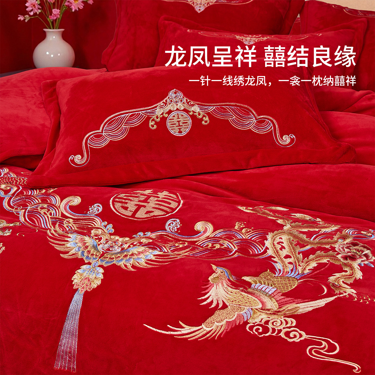 红豆婚嫁牛奶绒四件套冬天珊瑚绒结婚加绒双面床上用品红色喜庆