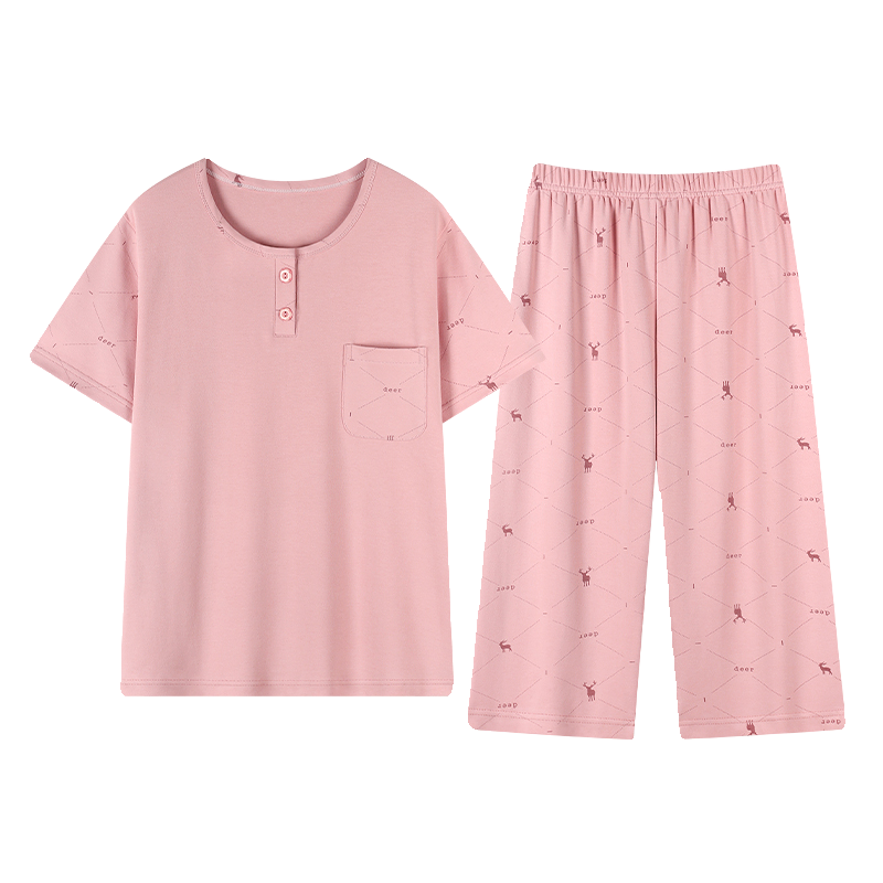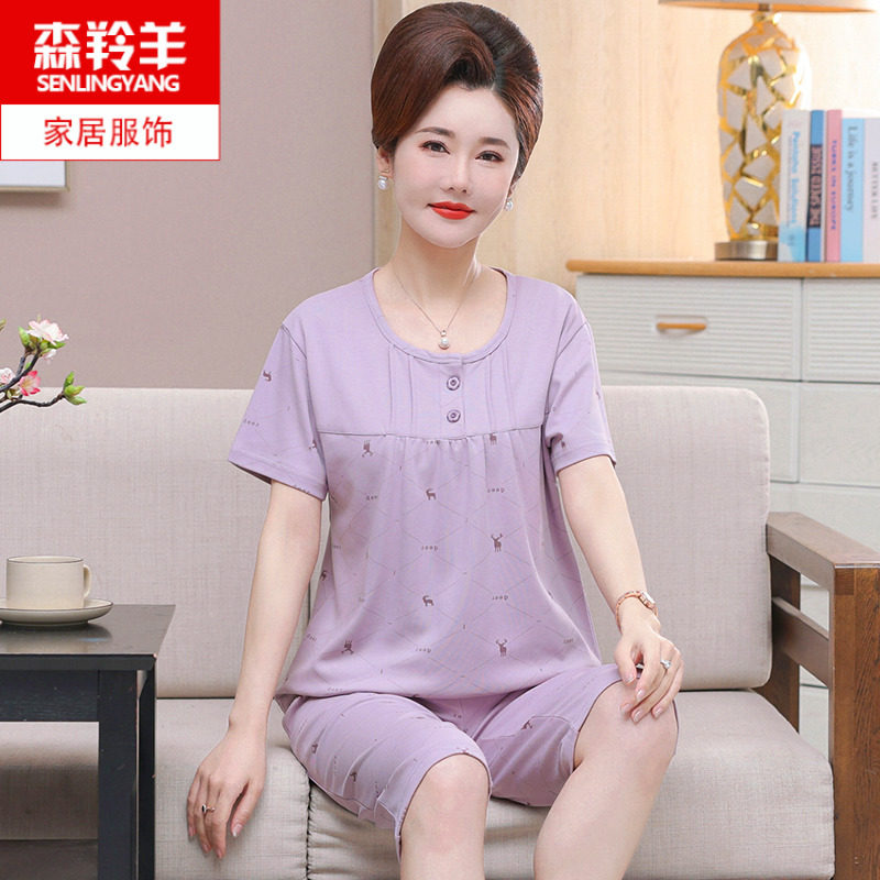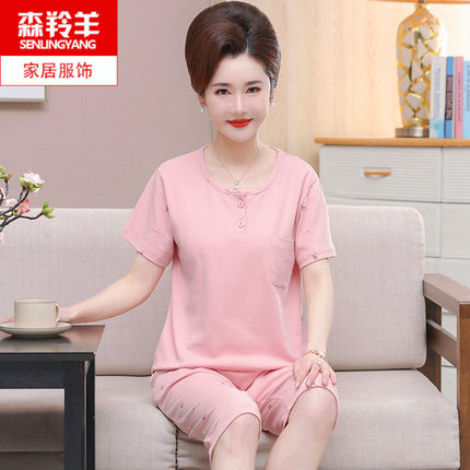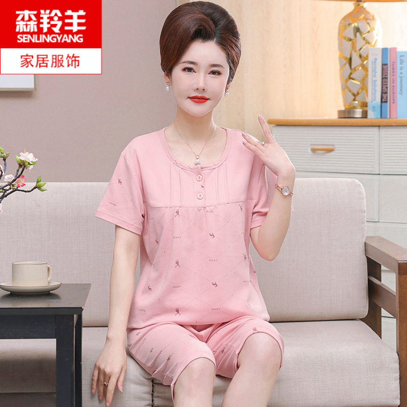 妈妈睡衣女夏季薄款纯棉短袖七分裤中老年女士家居服套头大码套装