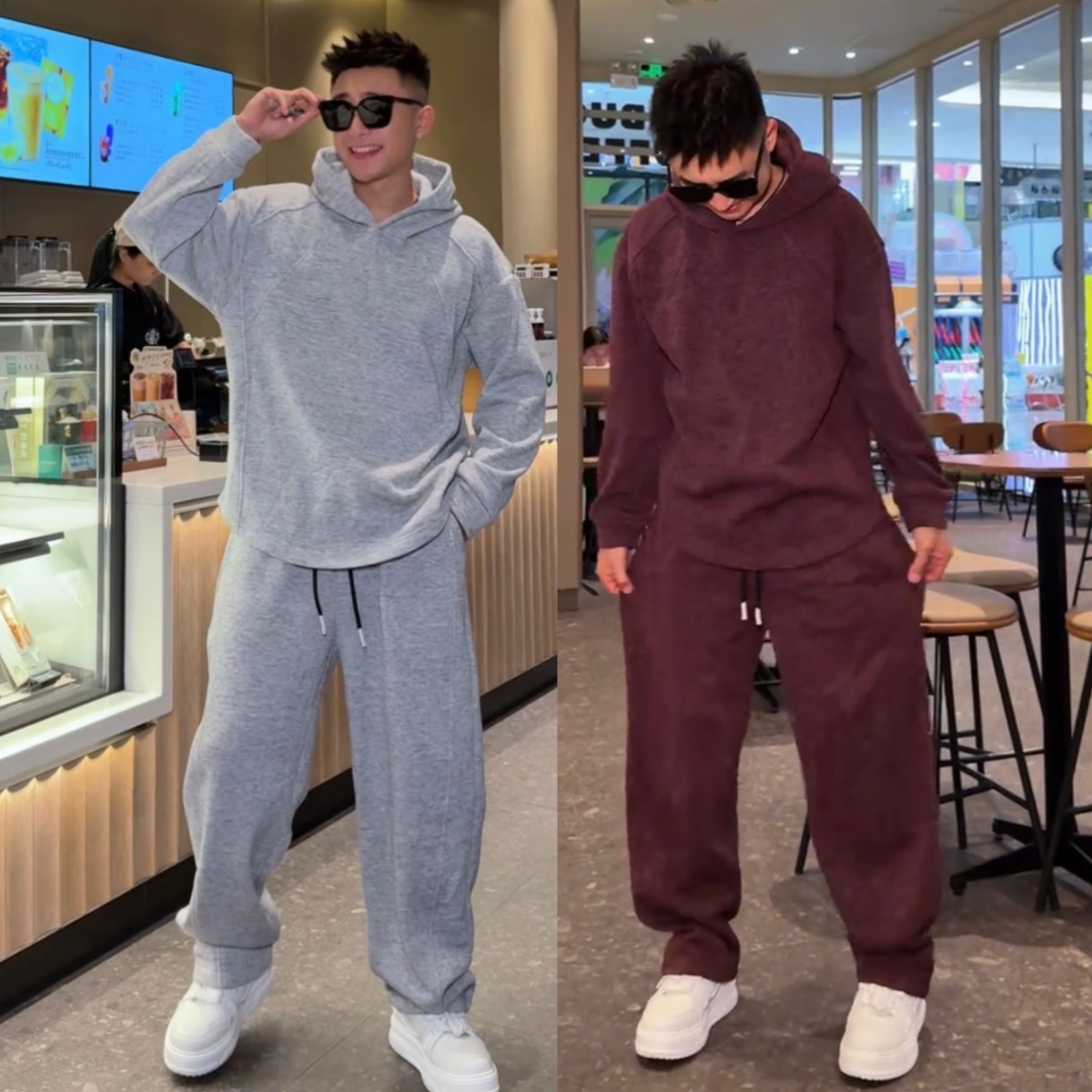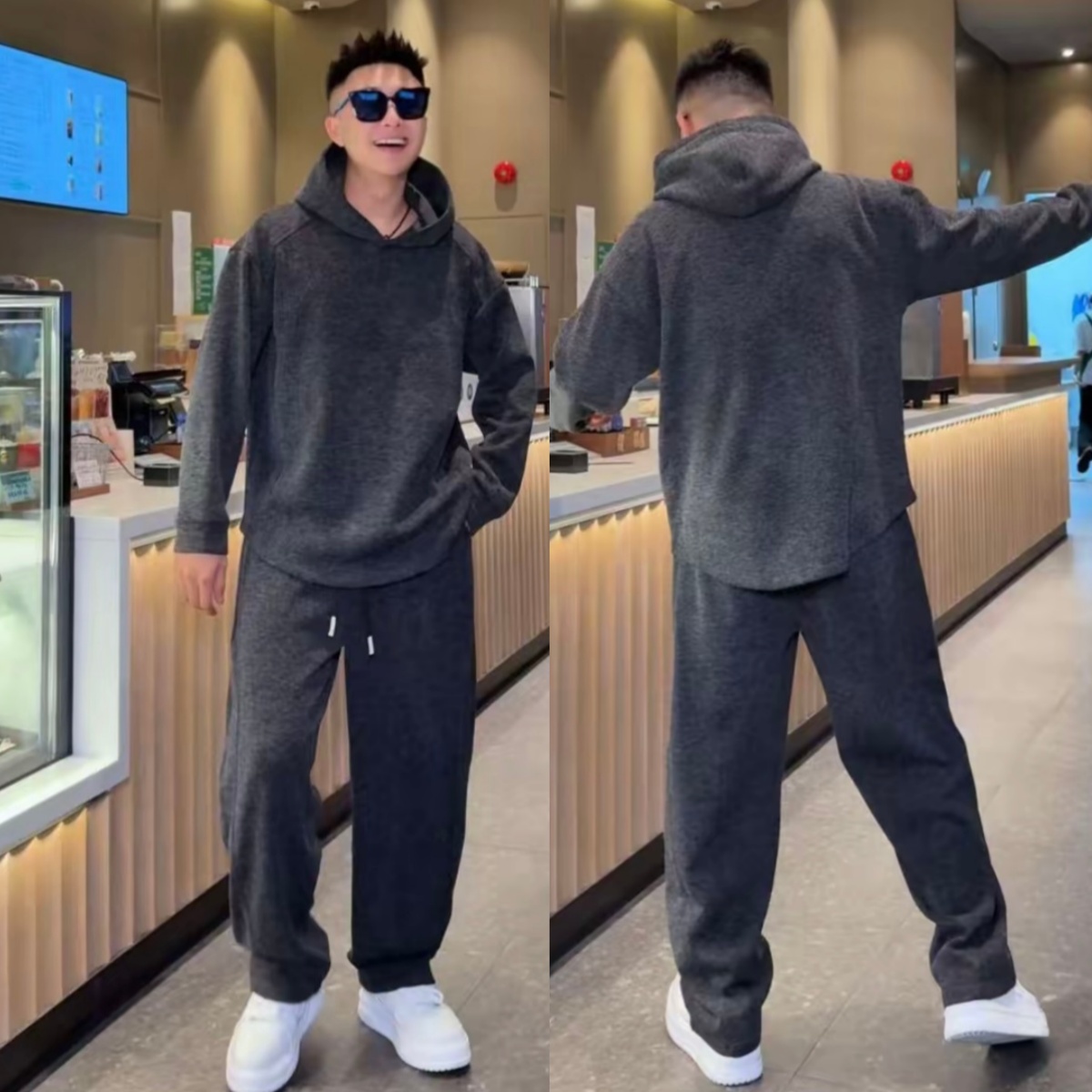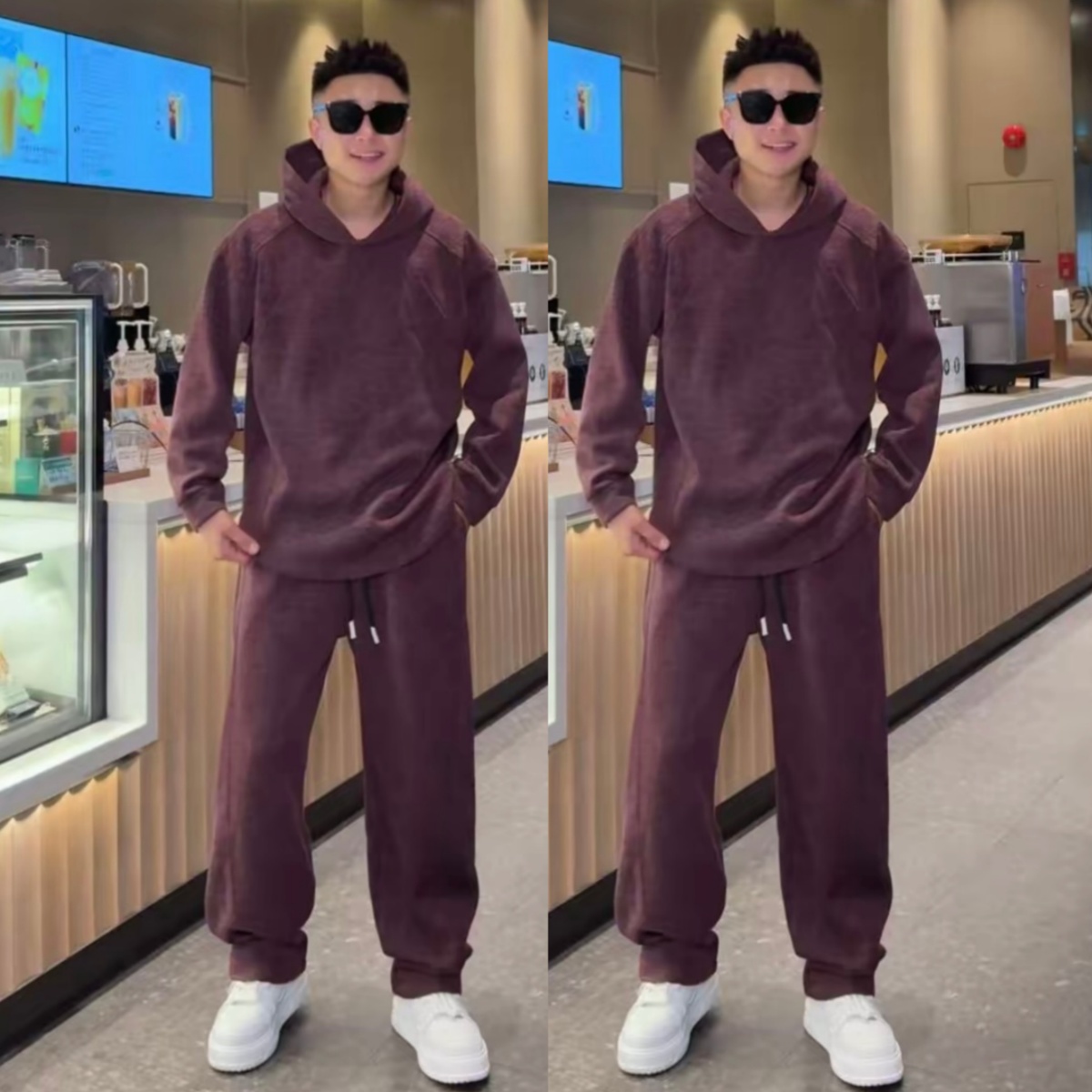 秋冬新款糯米绒休闲运动连帽套装男士加绒加厚卫衣直筒卫裤两件套