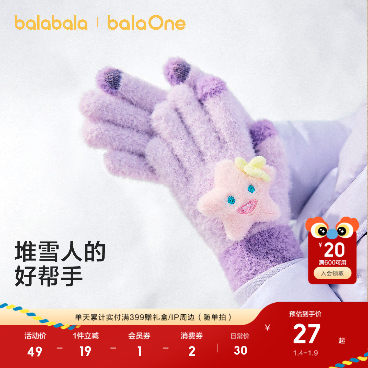 【balaOne】巴拉巴拉儿童手套男童女童2025新款卡通玩偶保暖舒适