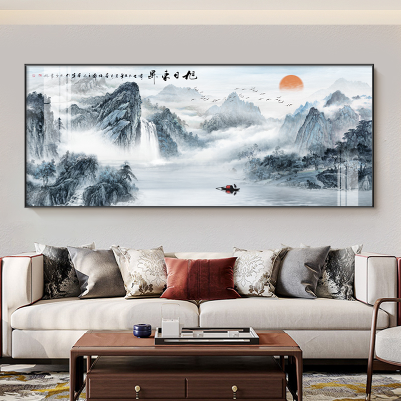 流水生财客厅装饰画沙发背景墙横幅办公室新中式山水挂画晶瓷壁画