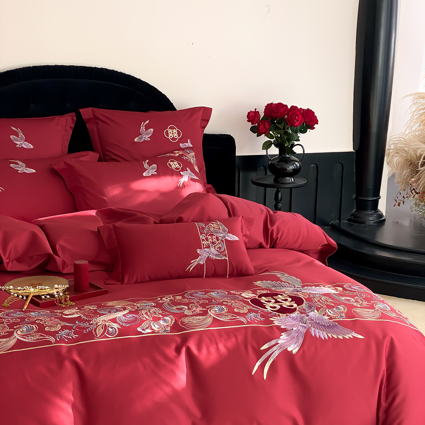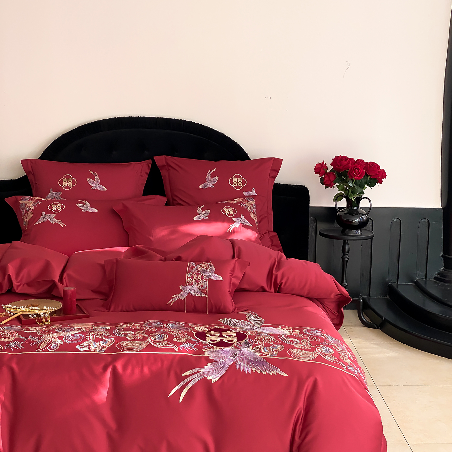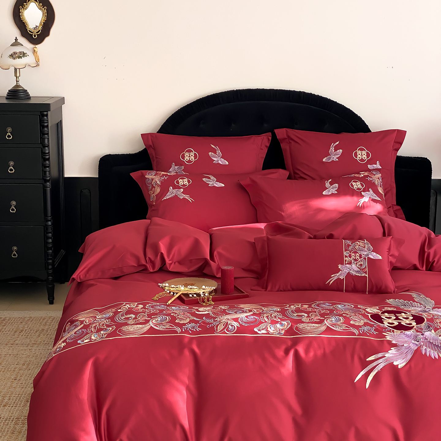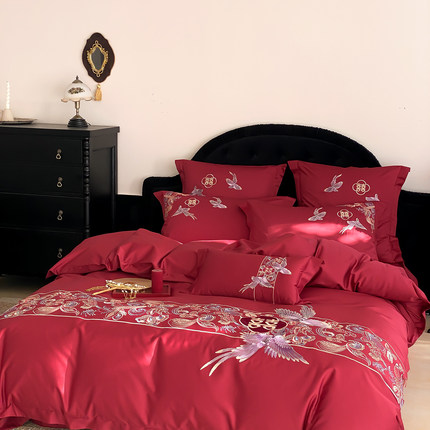 轻奢风婚庆四件套100S长绒棉纯棉提花被套高级感红色结婚床上用品
