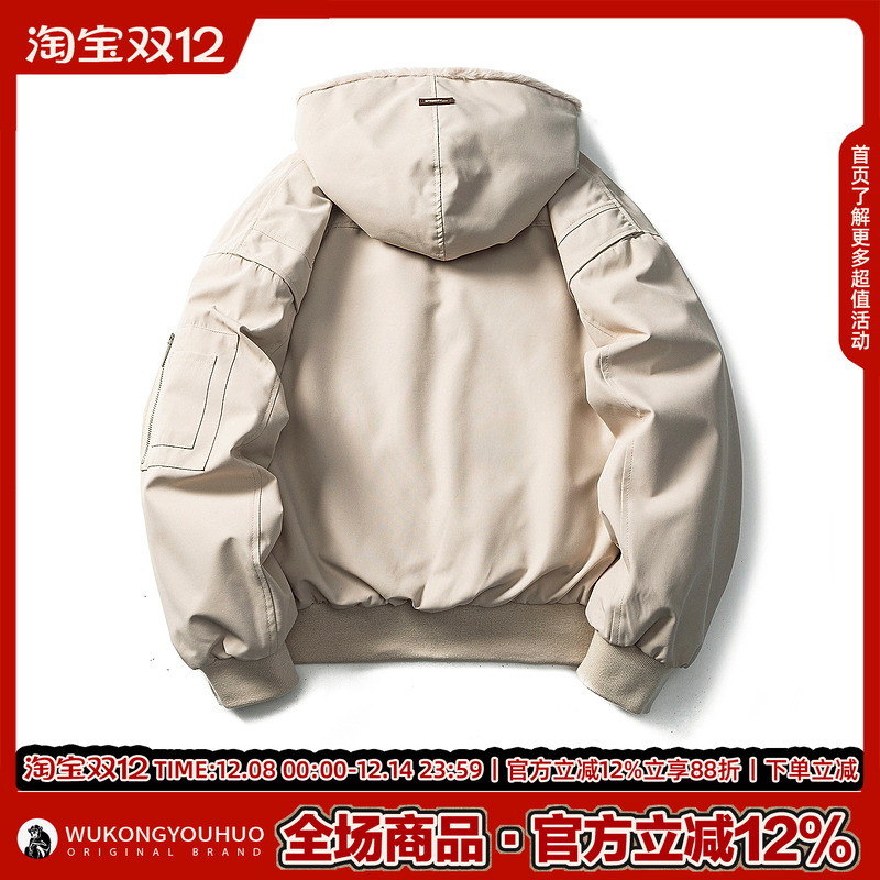 悟空有货冬季座山雕加绒加厚连帽棉服男美式飞行夹克重磅棉衣外套
