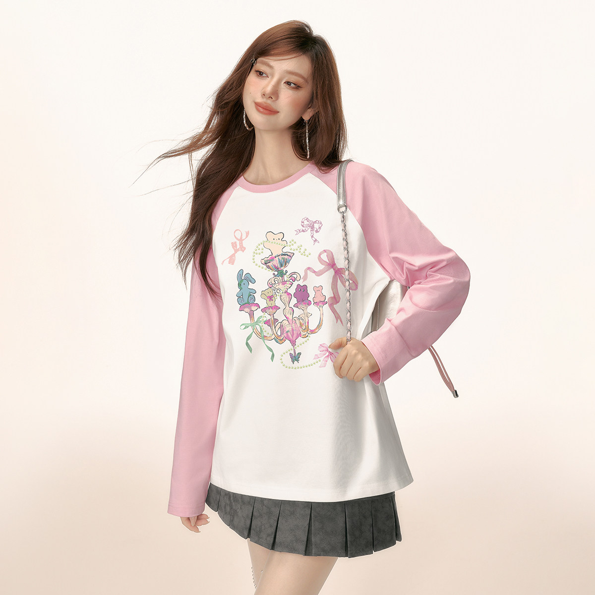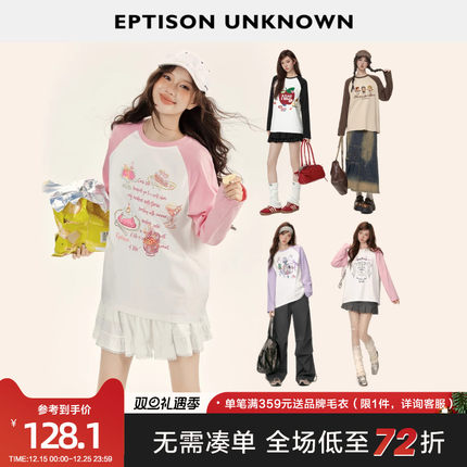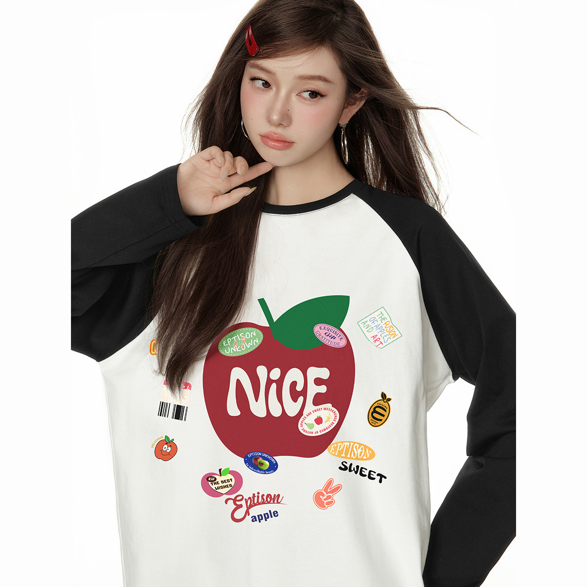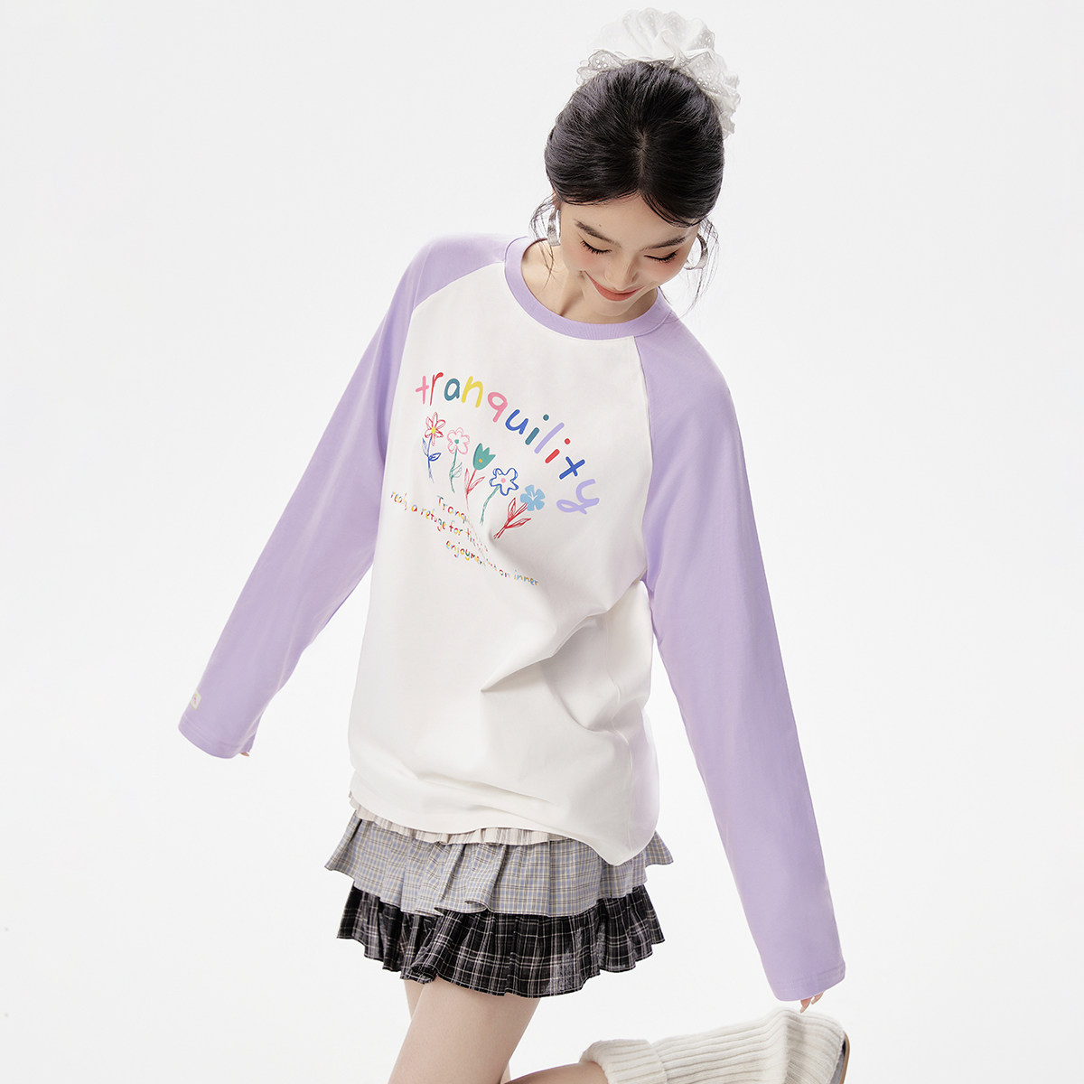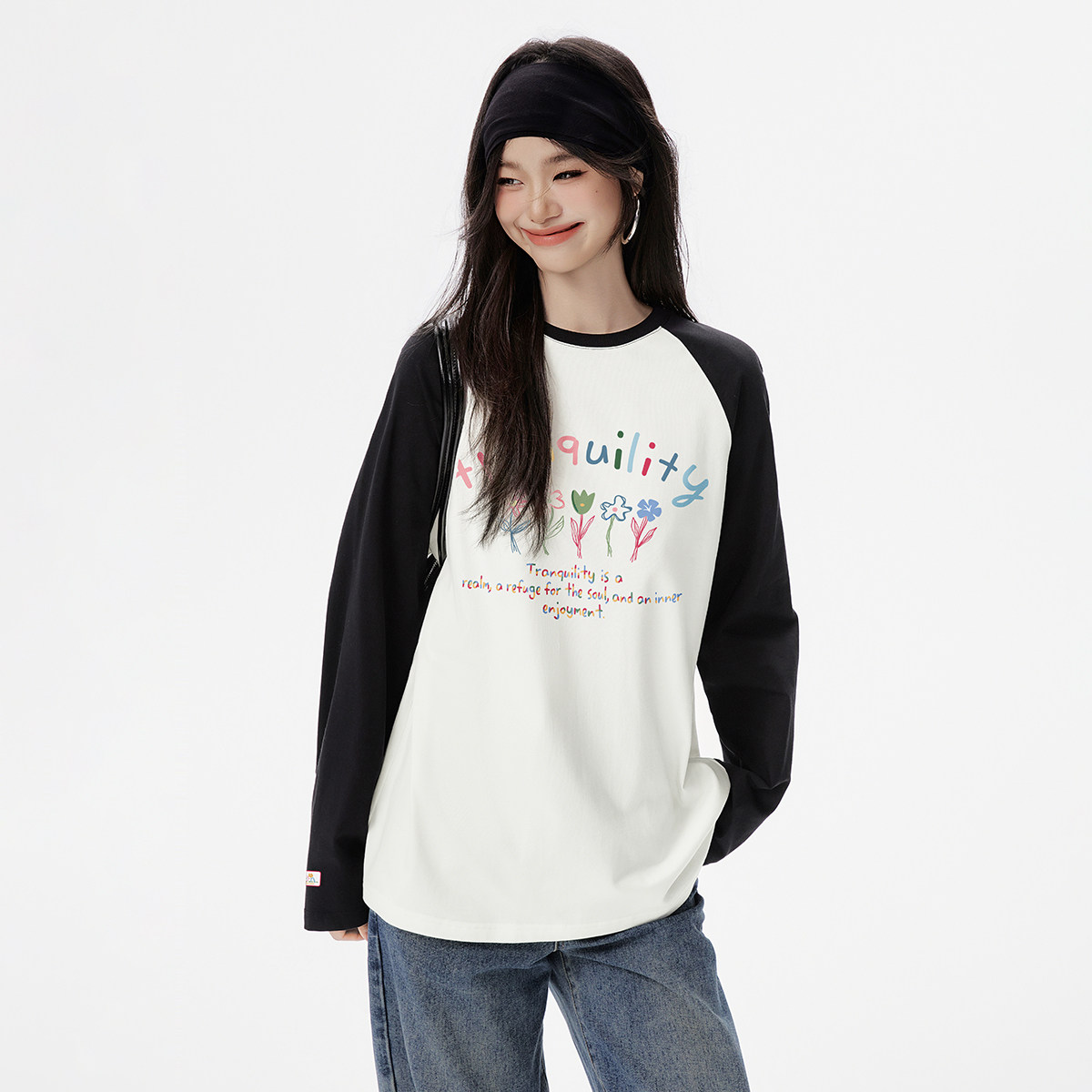 EPTISON长袖T恤女2025秋季新款宽松撞色插肩袖纯棉印花休闲风上衣