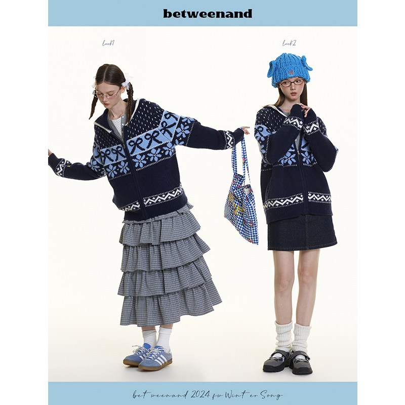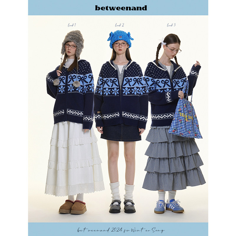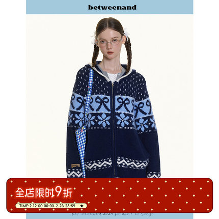 BETWEENAND 冬季氛围感费尔岛提花设计防风保暖连帽针织毛衣外套