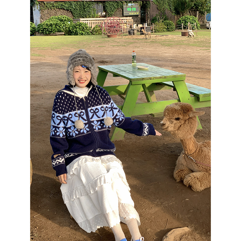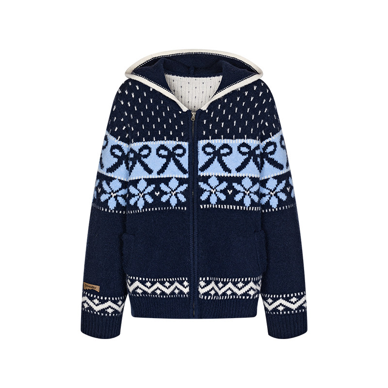 费尔岛提花连帽拉链毛衣外套