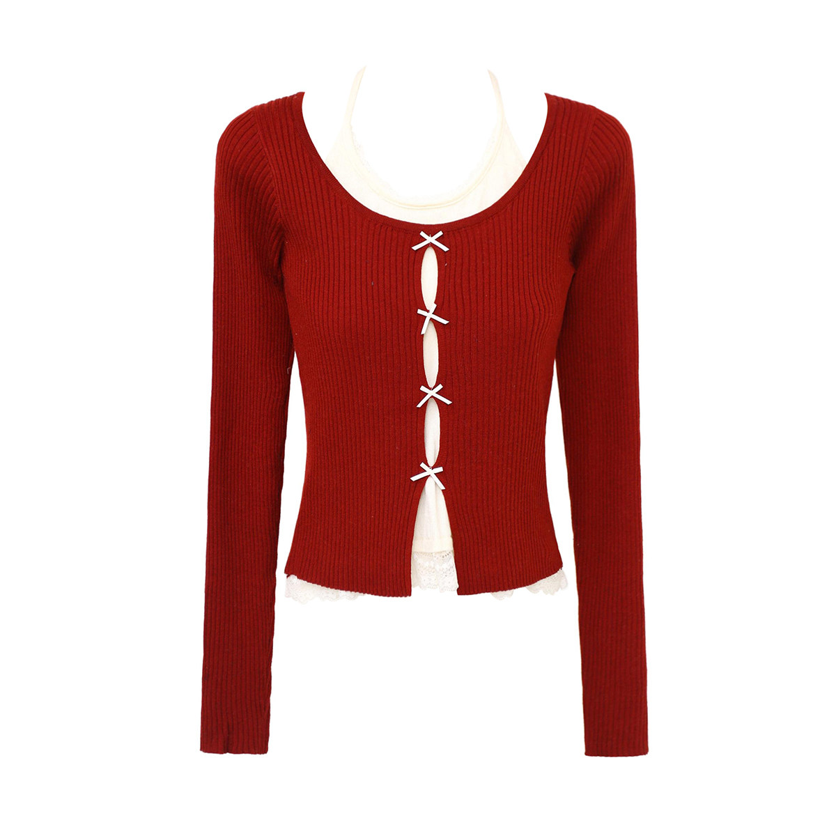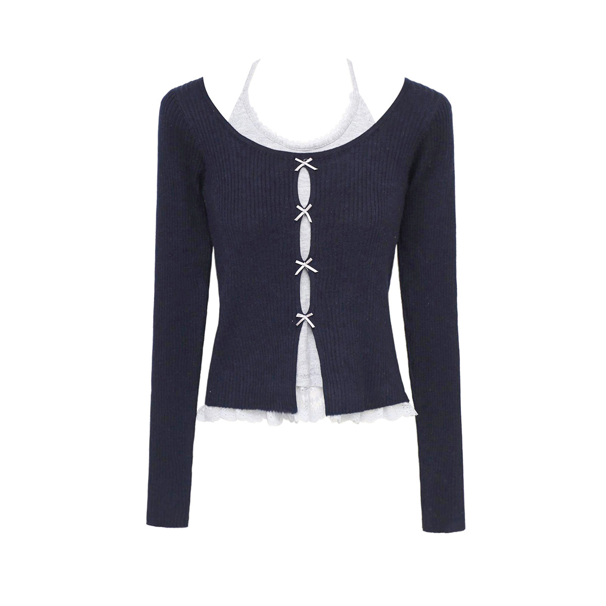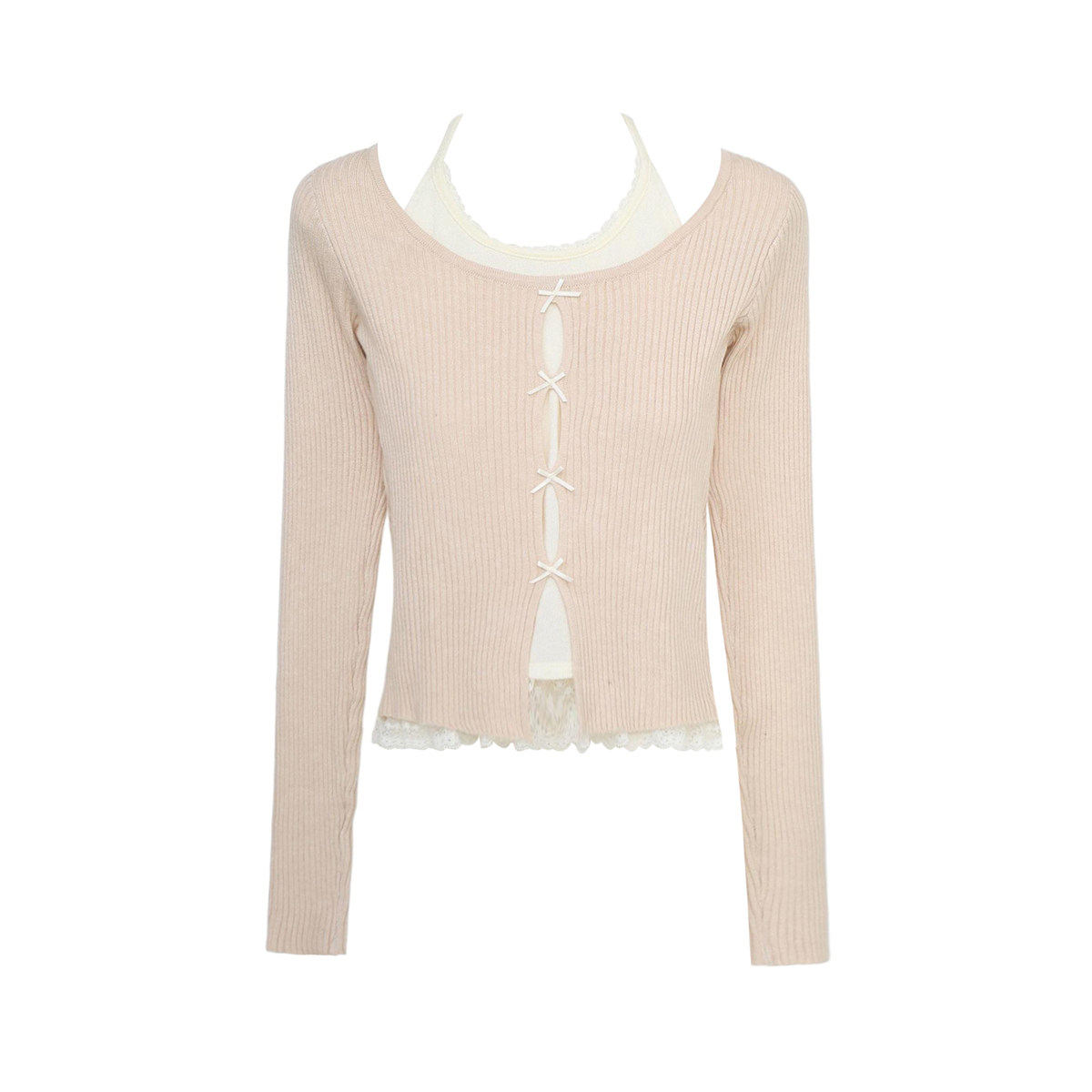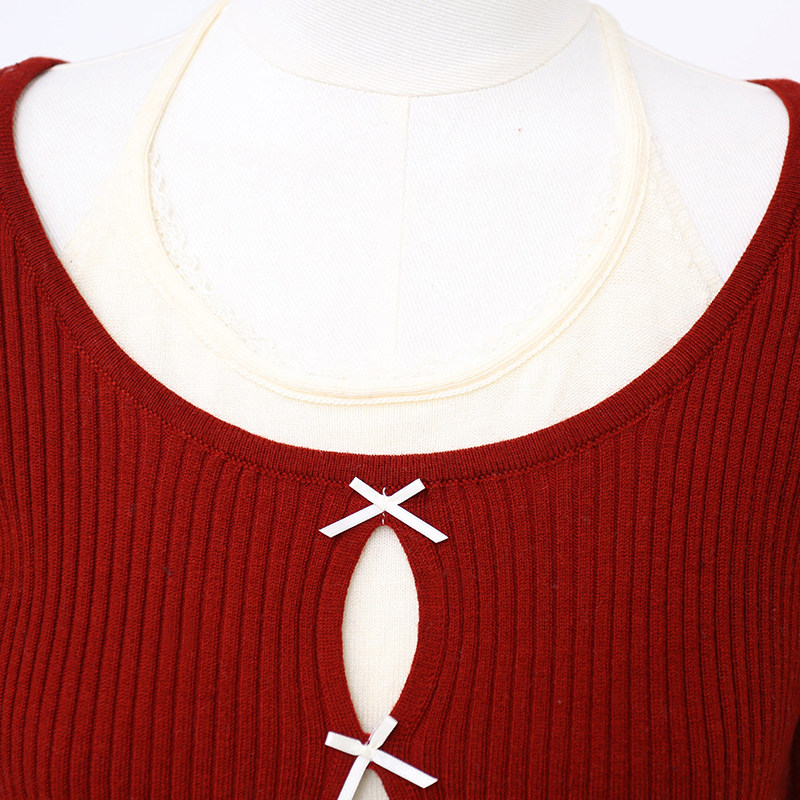 拾野森 秋装新款纯欲甜辣短款假两件蕾丝蝴蝶结挂脖长袖上衣T恤