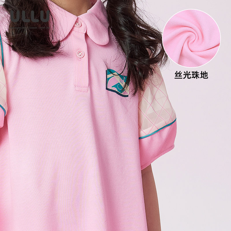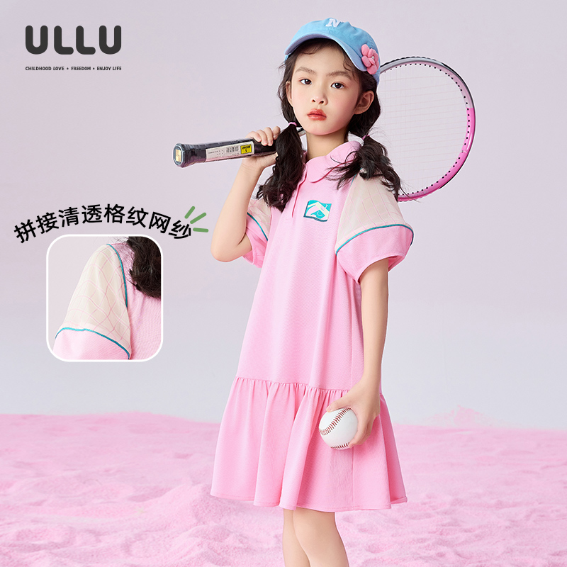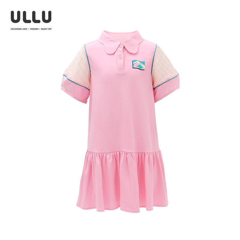 优露童装女童短袖连衣裙ULLU夏新款丝光珠地格纹透纱多巴胺polo裙