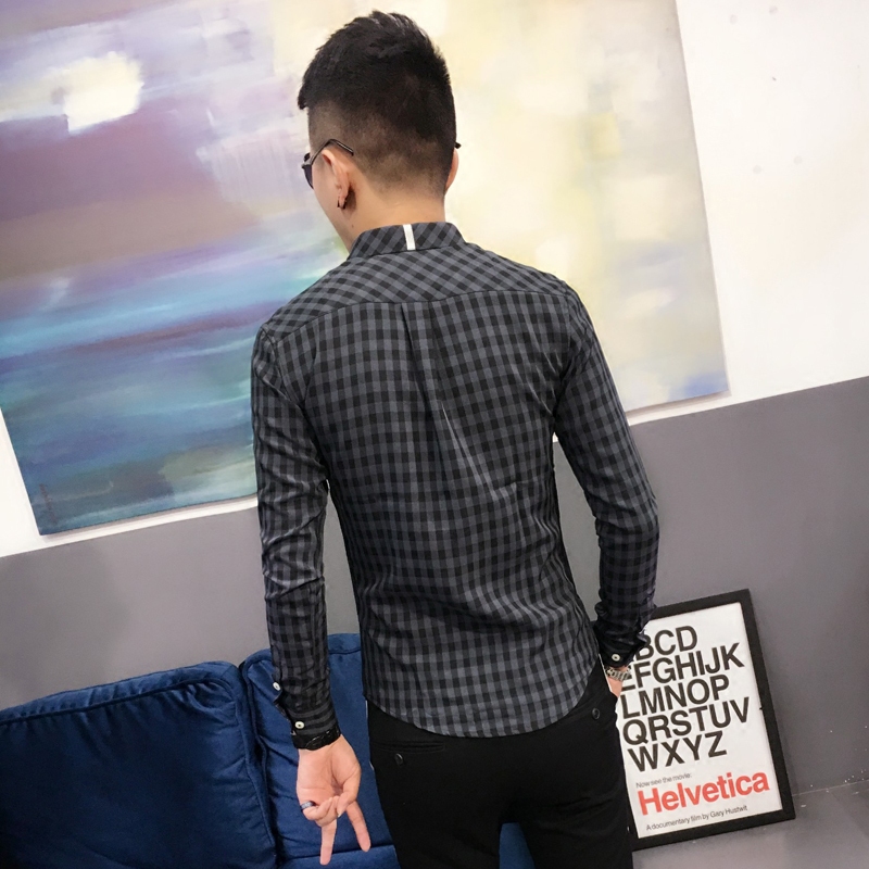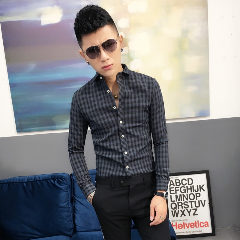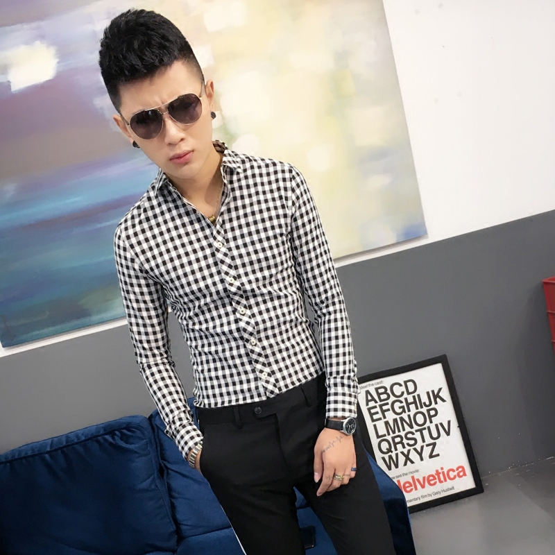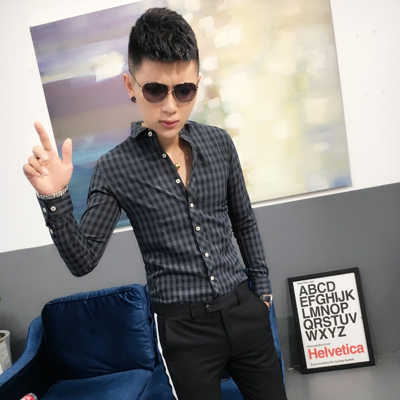 不二先生格子男韩版修身长袖衬衫夜店潮流时尚休闲帅气发型师衬衣