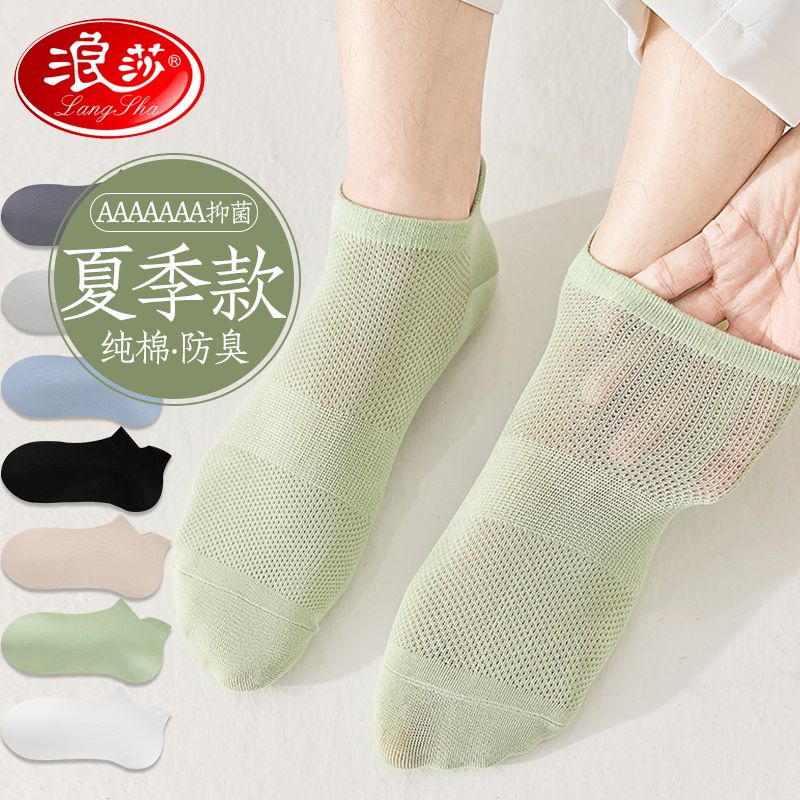 浪莎夏季薄款男士袜子纯棉防臭抗菌短袜夏网眼透气运动束腰男船袜