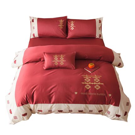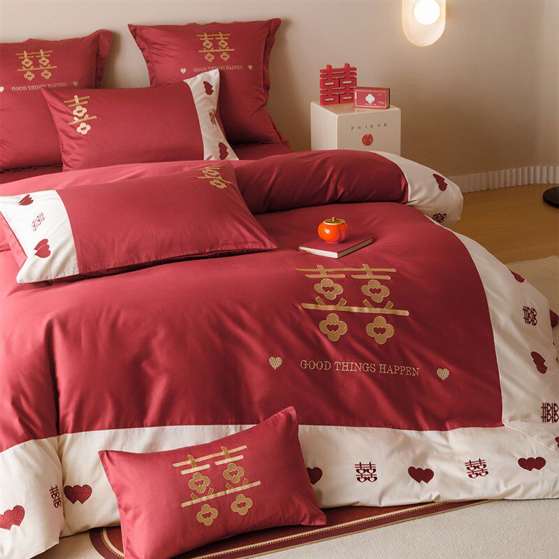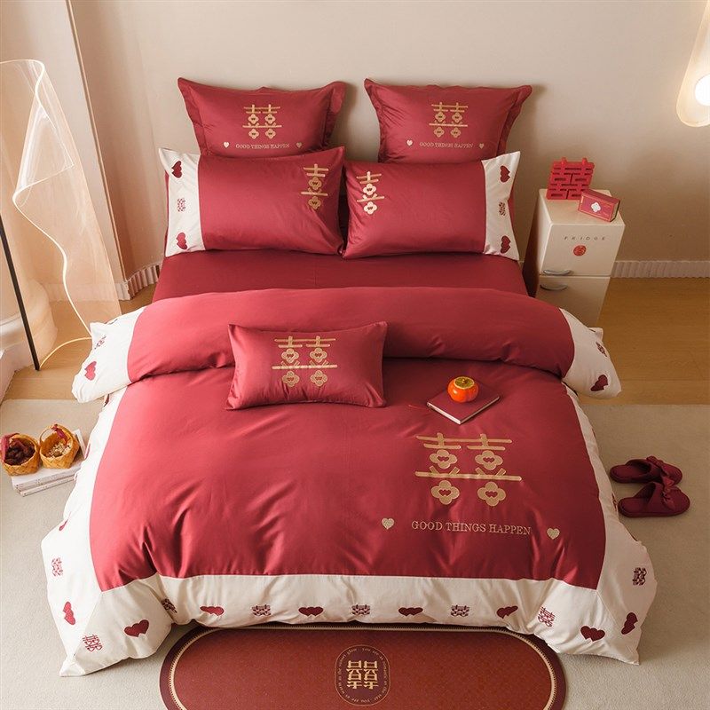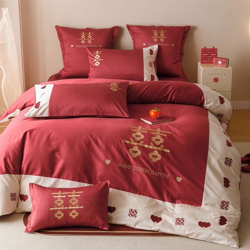 新中式婚庆四件套全棉100支长绒D棉红色喜字刺绣结婚被套床单床品