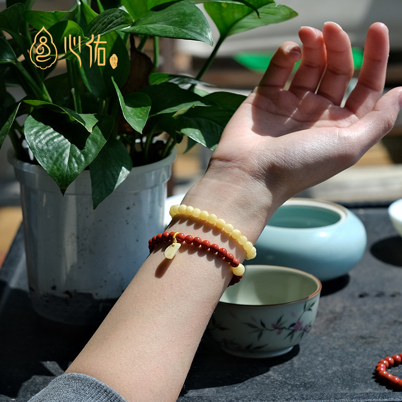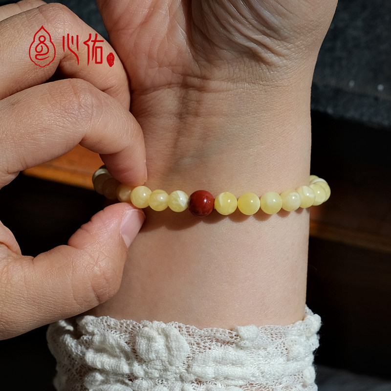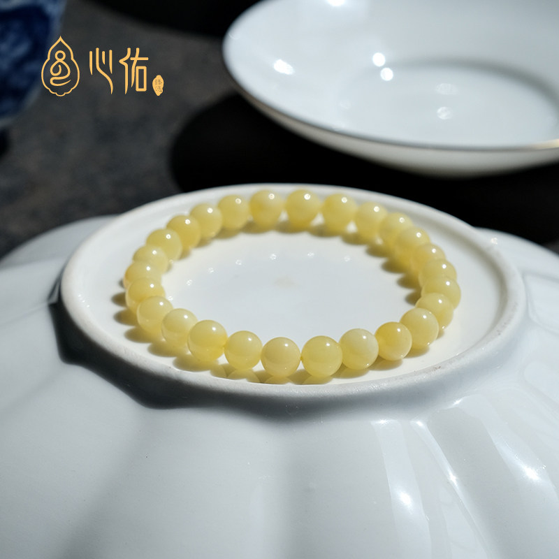 真品天然蜜蜡手串女款小米珠 俄料琥珀鸡油黄白花手串 血珀泊手链