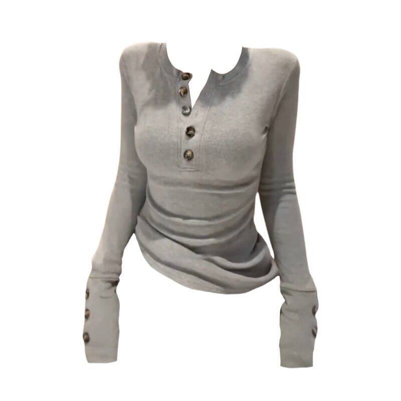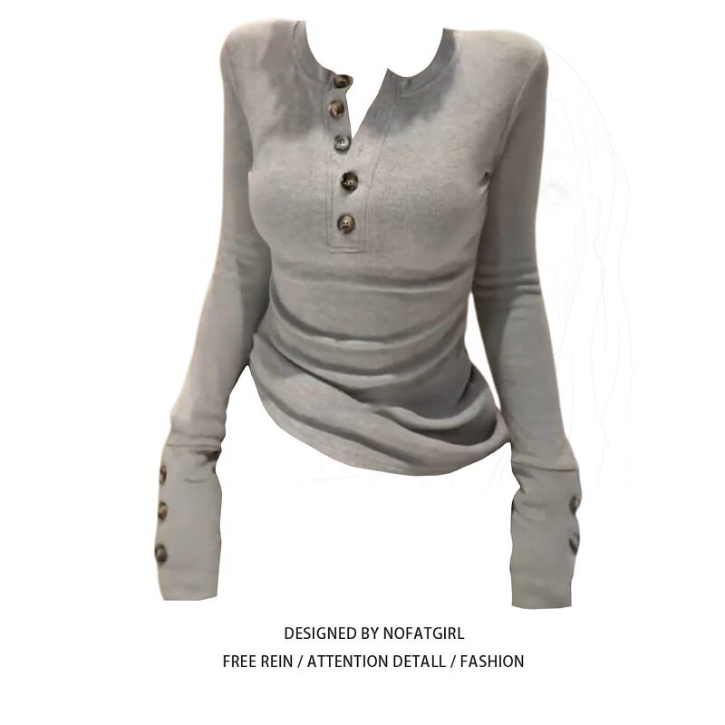 大码胖MM纽扣修身长袖T恤女秋季2026新款显瘦时尚气质打底衫上衣
