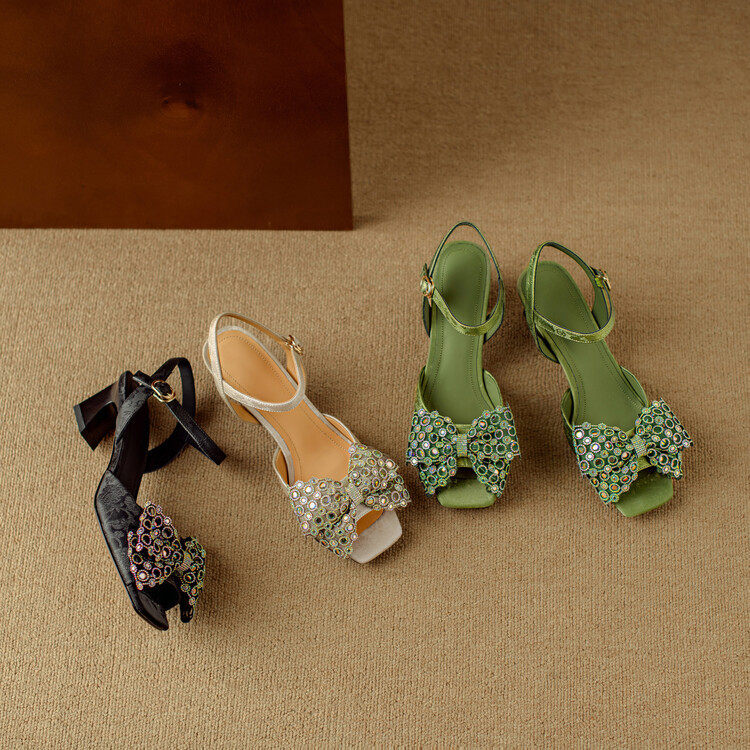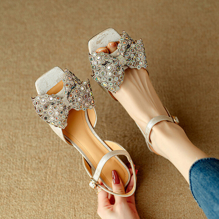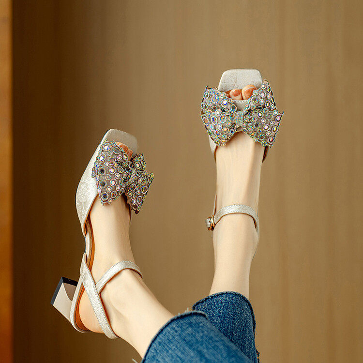 真皮仙女粗跟露趾凉鞋2024新款夏季配裙子中跟蝴蝶结一字带高跟鞋