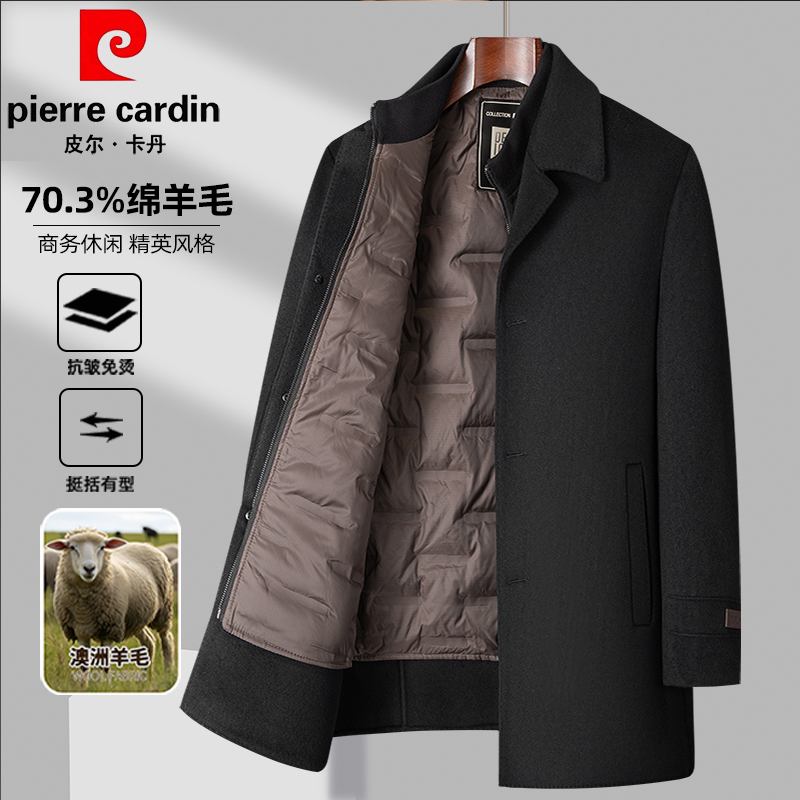 皮尔卡丹双面羊绒大衣男士中年冬季保暖羽绒内胆可拆羊毛呢外套
