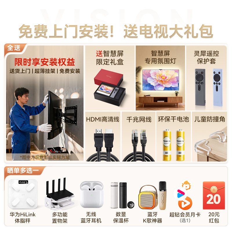 免费安装!华为Vision智慧屏5 65/75/85/98英寸鸿蒙灵犀华为电视