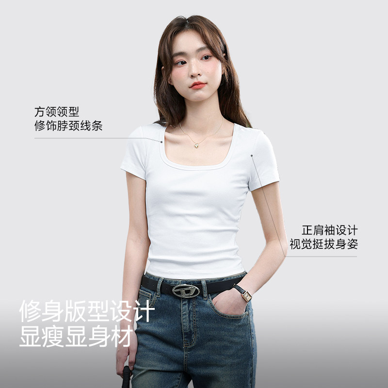 KCV真维斯2026夏季新款方领T恤韩版纯色气质百搭黑色显瘦短袖上衣